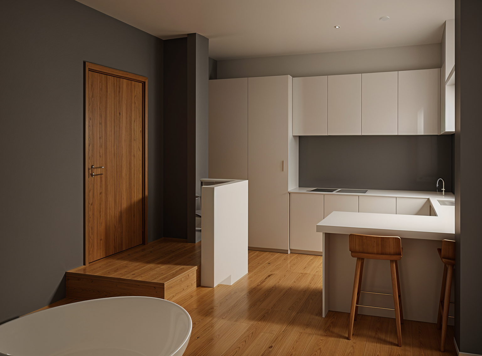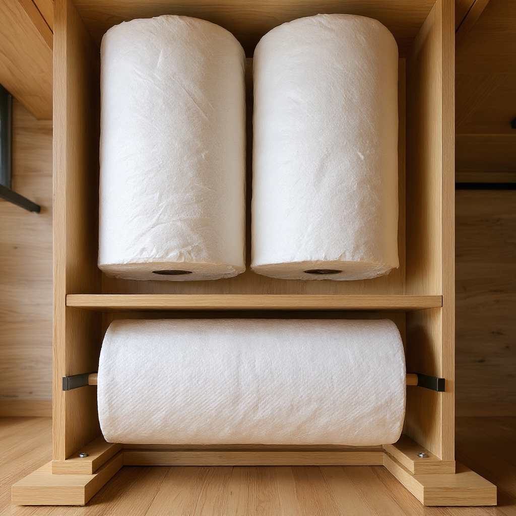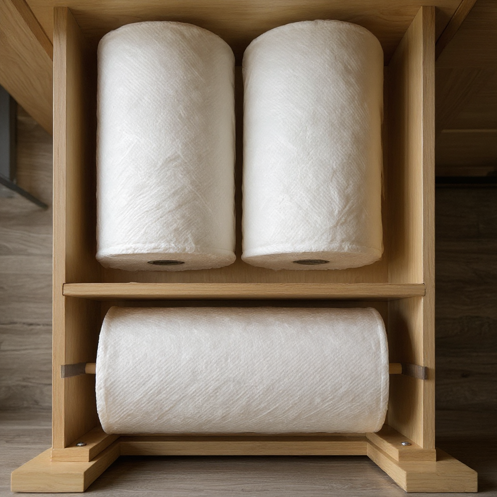 add natural lighting blur out the flooring in the background remove the plastic on the paper towel rolls do not change anything about the drawer at all