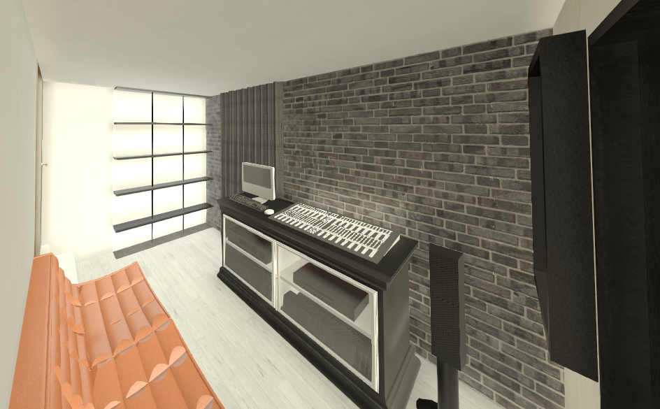 ultra realistic professional home recording studio interior alternate camera angle view cinematic architectural visualization modern cozy studio acoustic treated walls with fabric panels and exposed brick texture shelves on the side wall with studio gear and decor large stretched backlit lighting panel behind the shelves creating a soft glow realistic shadows and light bounce premium studio desk with computer and audio equipment textured curtains detailed leather sofa natural materials subtle reflections global illumination ray tracing depth of field interior photography style balanced composition warm ambient lighting 4k photorealism