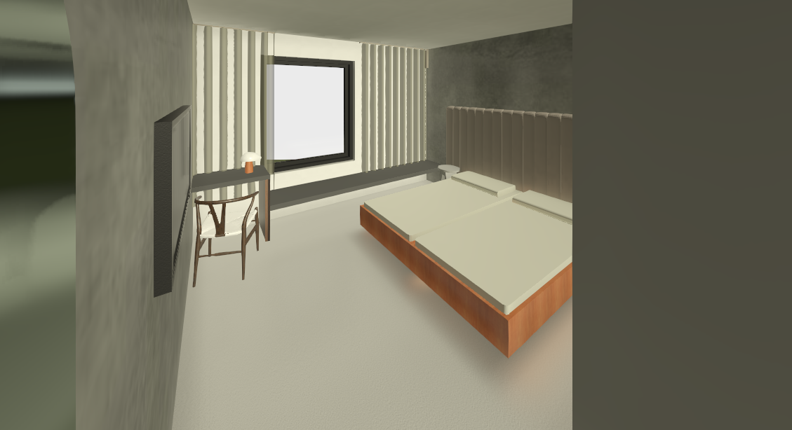 white oak wood floor beige headboard bed frame oak and cabinetry walls painted in beige stucco microcement door in oak material