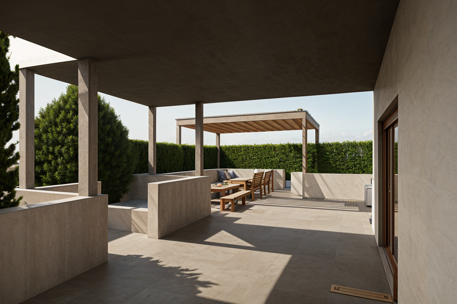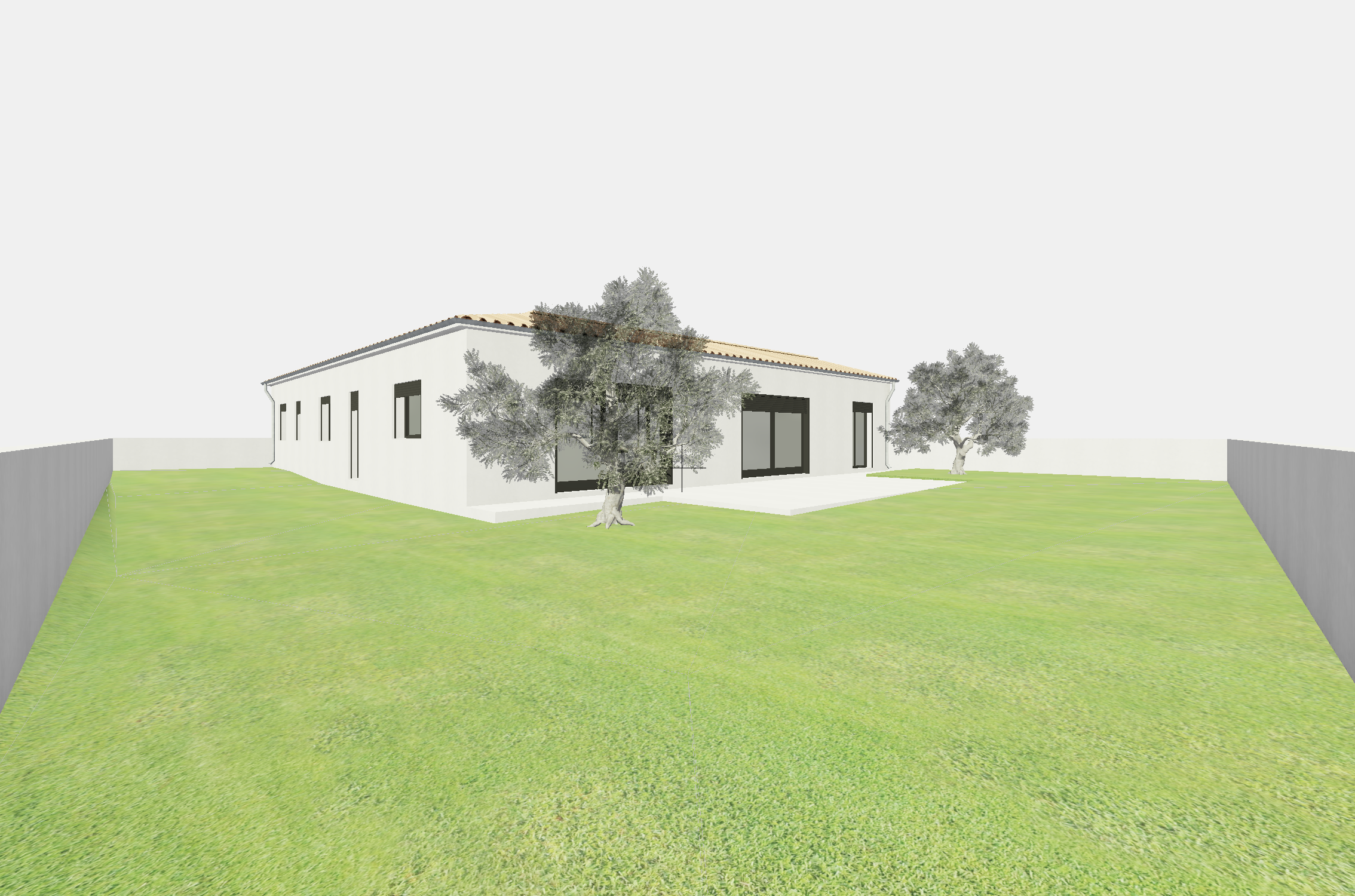 2 olive trees on each side of the terrasse and some mediterranean pine trees in the background add some palm trees and some lavender on the grass the plants are more organised there is a mix of lavender and other mediterranean plants