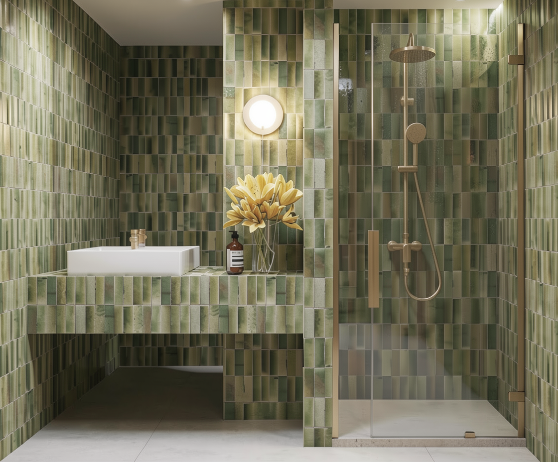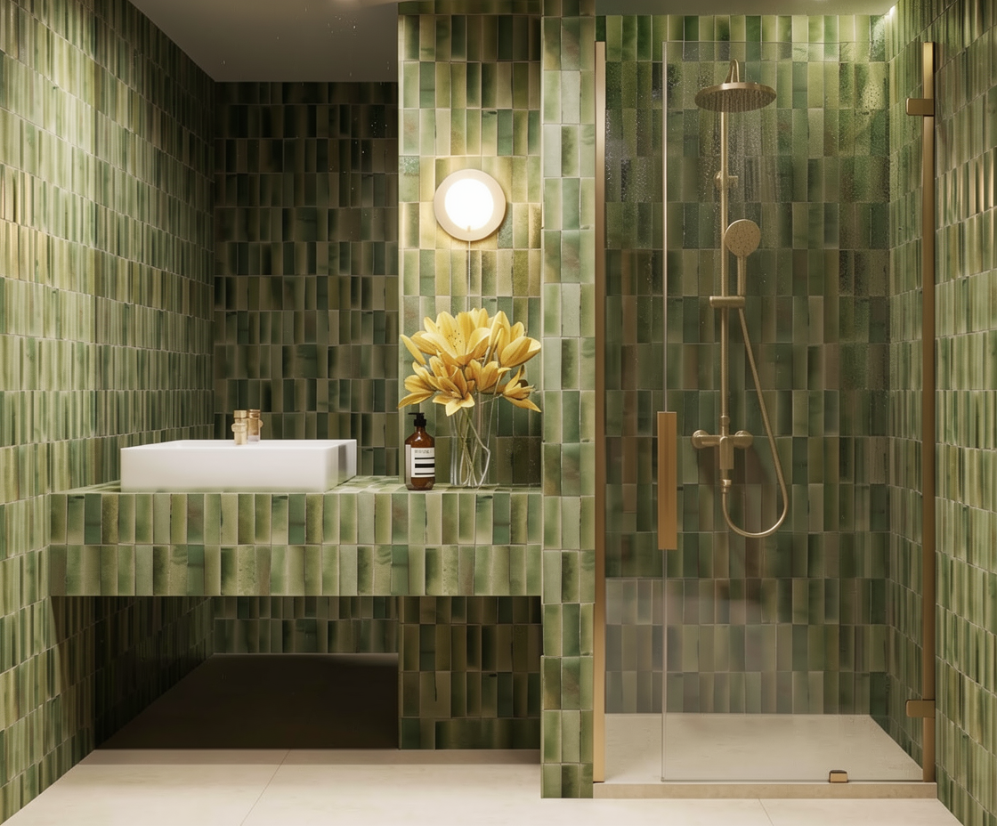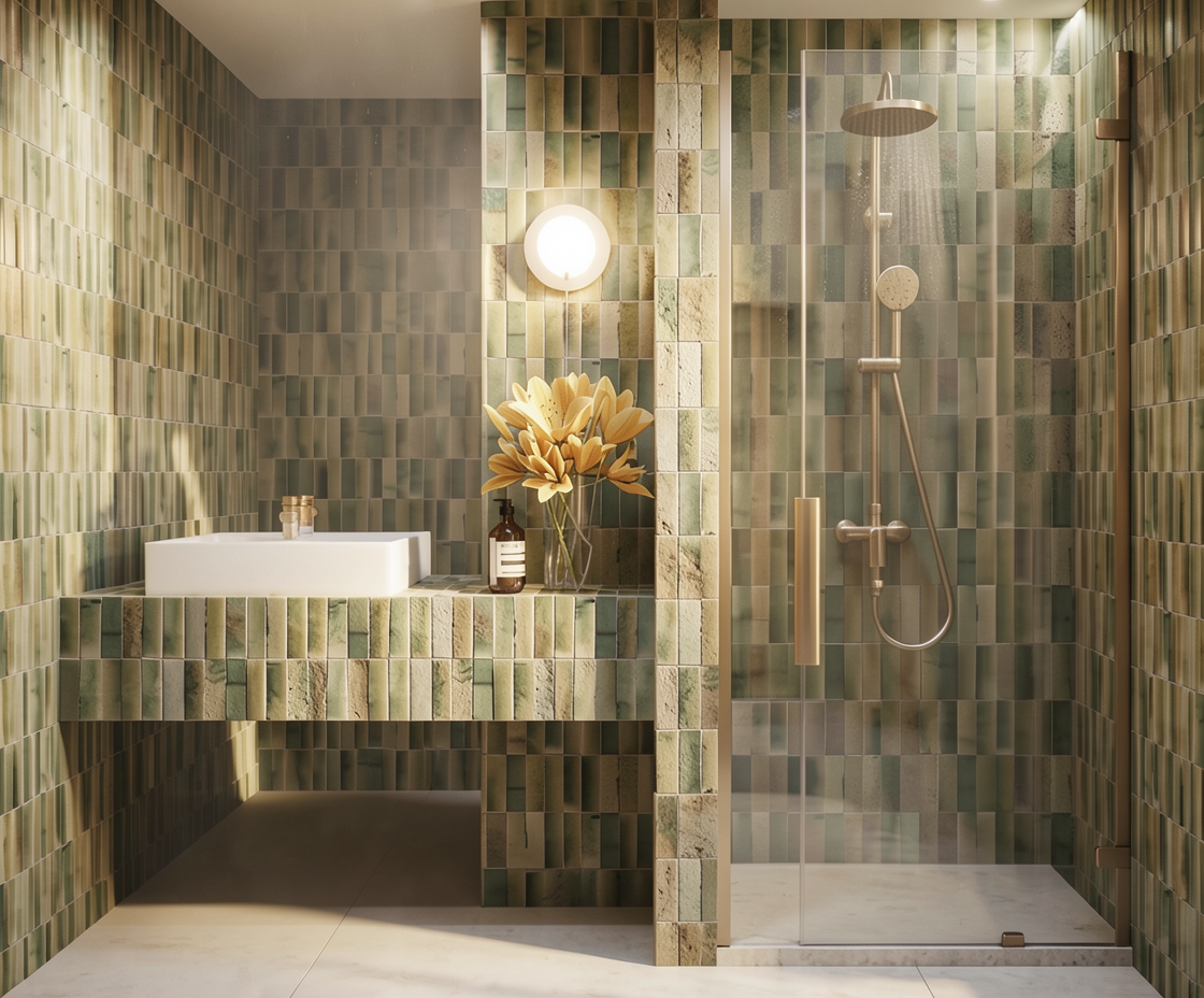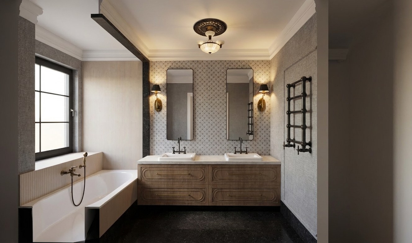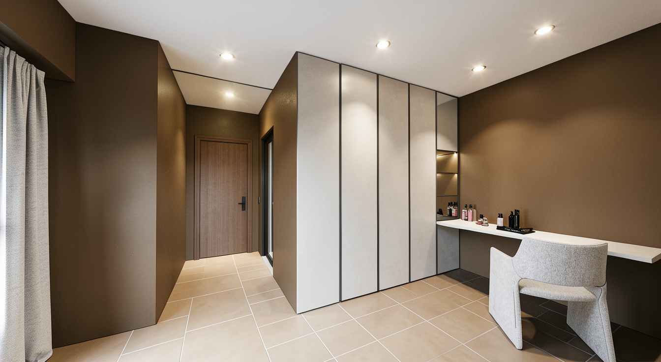 minimalism exterior shot add some ceiling down lights a small vanity mirror and some cosmetic products on the table floor tiles should be 60x60 matte biege wall paint should be creme white architecture