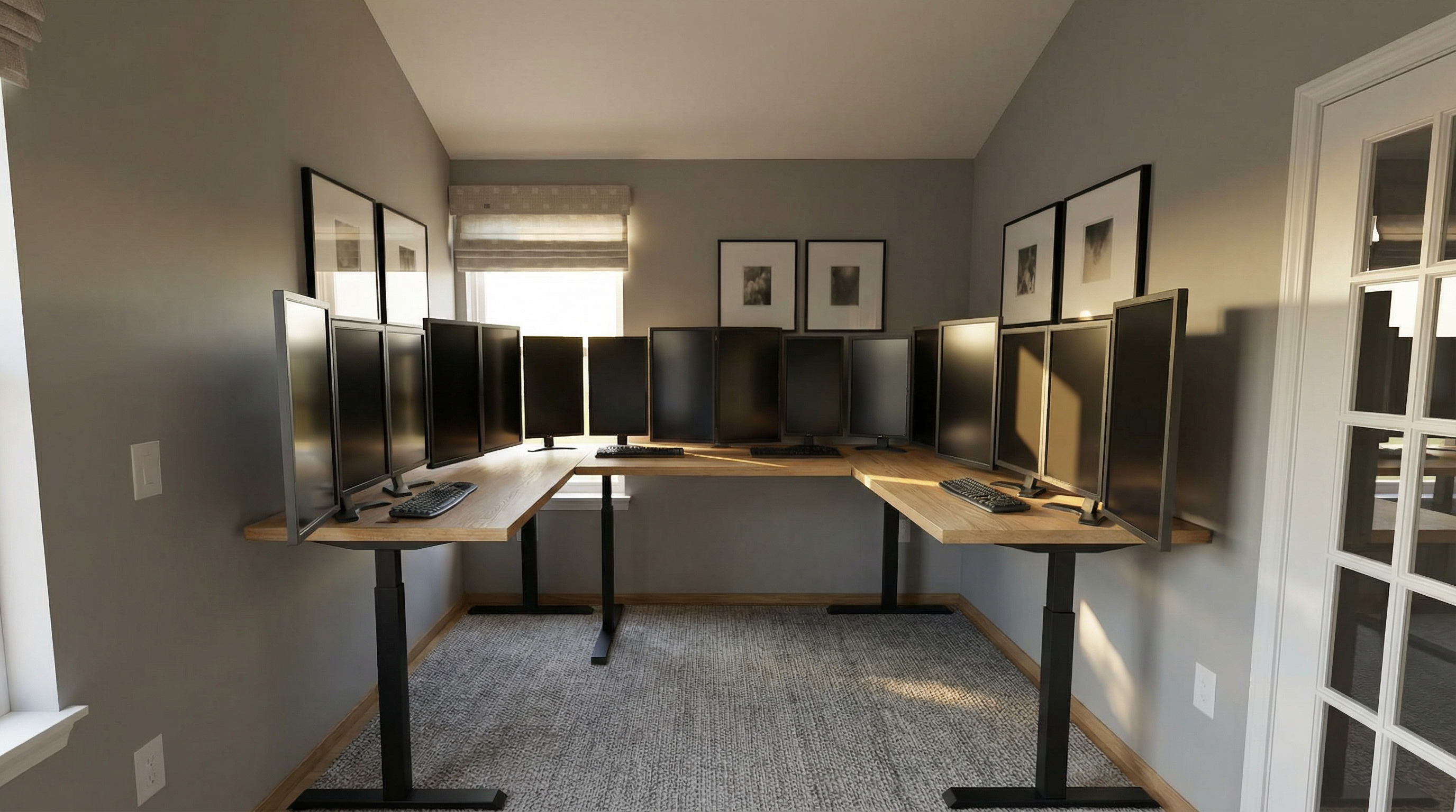 render in a realistic way with natural light raking in from the right window the walls are a grass cloth wallpaper and the floor and the closet on the right is white oak the rug is a light tan woven wool make the wallpaper lighter make the curtain rod chrome and the curtains fully opaque the floors are light oak and the nightstands are light ash wood the bench is a grey white and tan small check pattern and a light white oak shelf keep everything the same but the blanket is light tan keep the perspective the same as in the image
