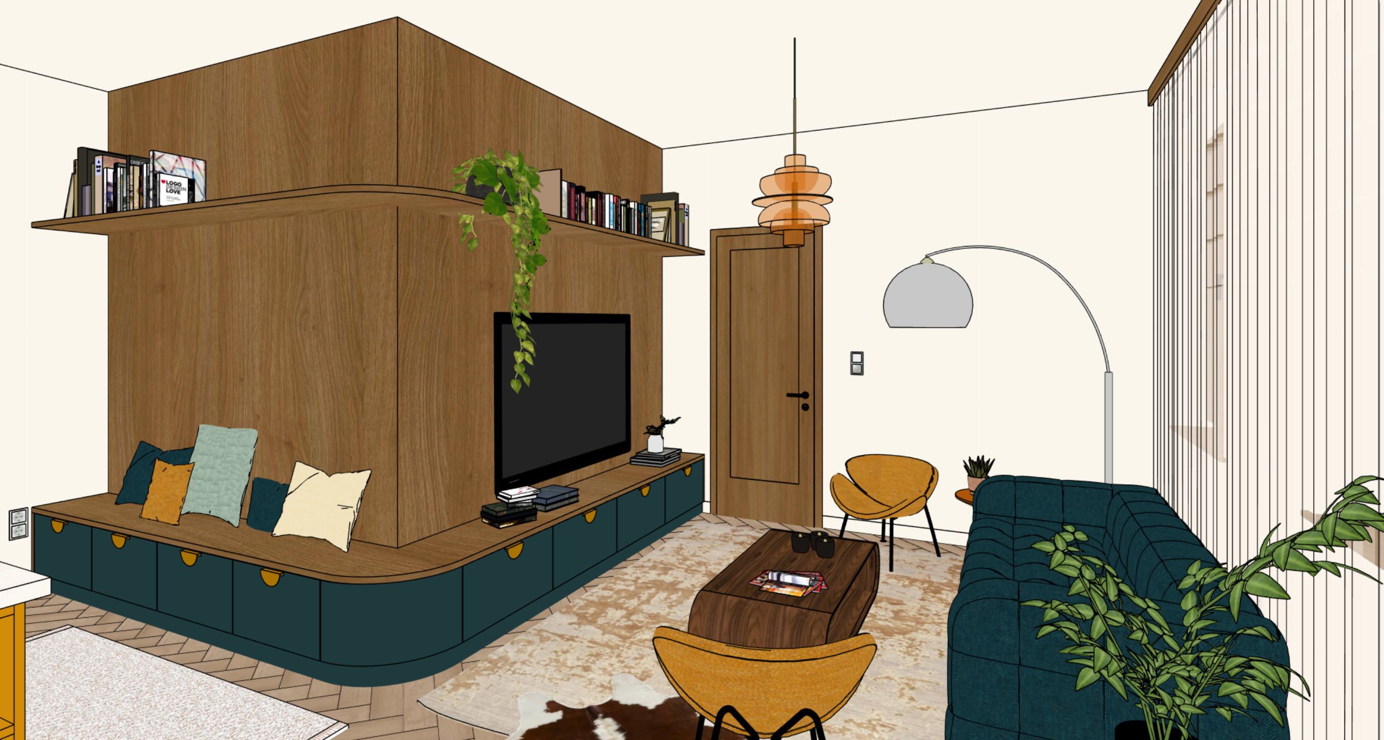 living room with bright colors on the right there is a bright teal sofa with the famous orange slice chairs on either side in bright mustard color in the right farther corner there is a mirror chrome 70s floor lamp emmitting warm light the coffe table is rounded and loop shaped from the side above there is an orange glass spaceage pendant light emmiting warm light there is a positive corner opposite the camera and its walls are clad in warm toned wood on the lower part of it there bright teal painted are cabinets with bright mustard colored semi circle shaped ikea begripa handles and a wooden top the cabinets turn around the corner above them there is a floating shelf in the same shape with an led strip light in its inner upper corner emmitting warm light towards the ceiling the shelf also turns around the corner above the cabinets on the right side there is a wall mounted tv on the floor there are soft cream colored rugs it is bright daylight pouring in from the big windows on the right the windows have sheer white curtains