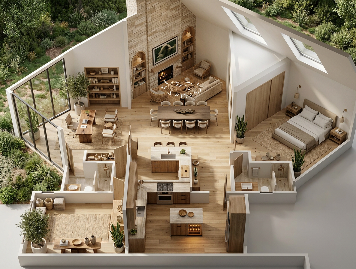 create ultra realistic images without changing any structure shape design or materials do not resize jpegs beige wood vinyl flooring plain off white walls add indirect light add outside view in the windows