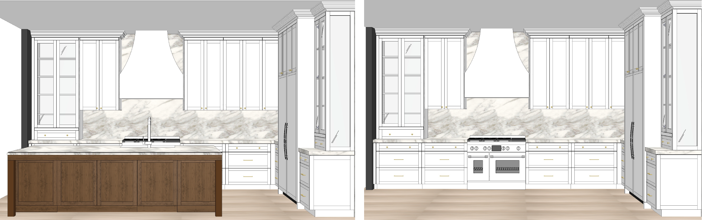 turn these into a single rendering of the kitchen add pendant lights above kitchen island add decorations add 3 stools at backside of island remove left wall