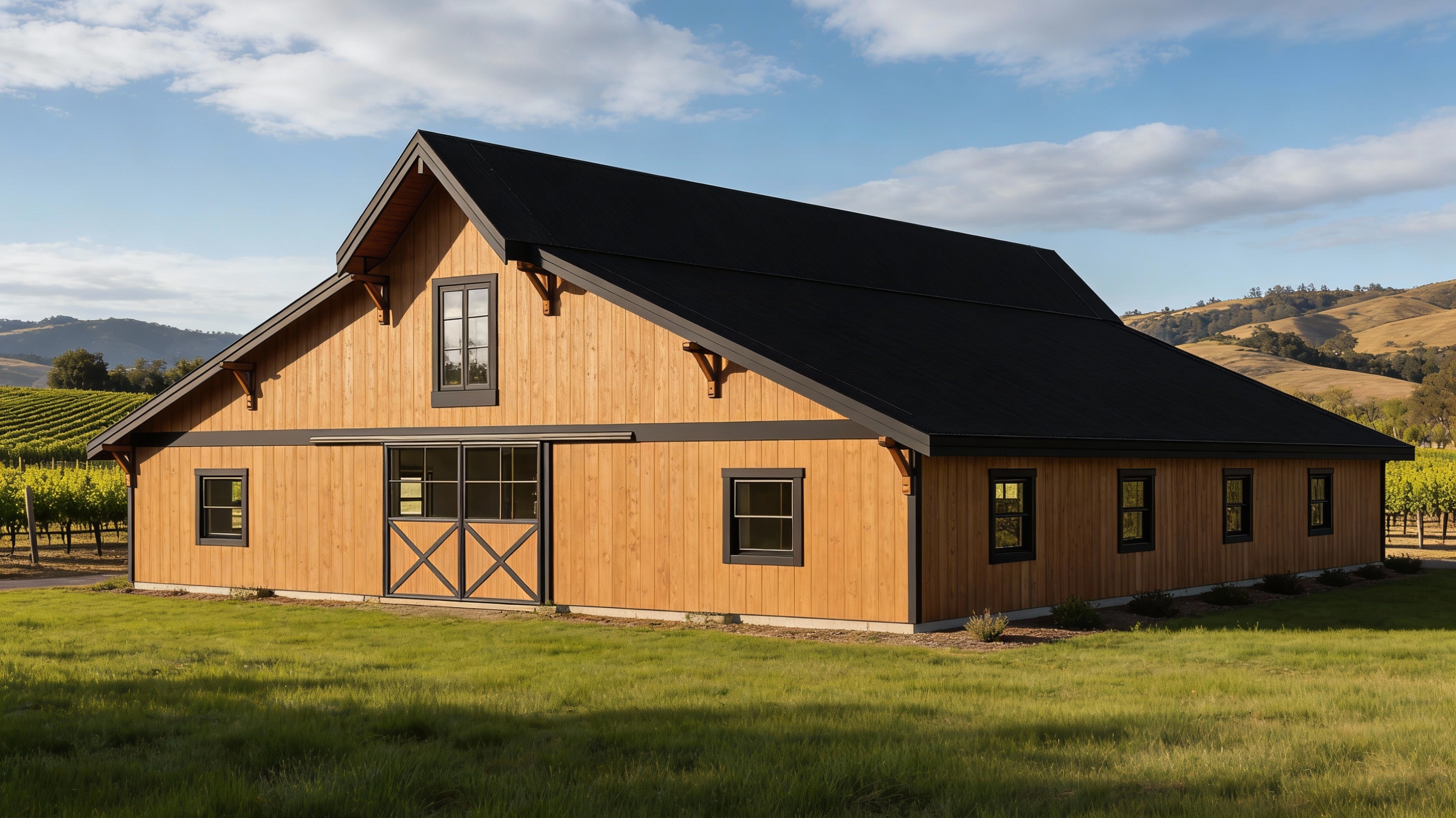 clean timber clad wedding venue architectural exterior rendered in cinematic photorealistic day time lighting beautiful blue skies with beautiful fluffy clouds dark trim around sliding barn doors warm vertical wood siding with similar simple minimal grain pattern black roof visible prominent napa valley winery landscape in the background natural wood textures high fidelity photorealistic visualization crisp shadow falloff refined facade geometry richly detailed grain patterns soft atmospheric depth calm minimal landscaping premium architectural photography mood ultra clean composition and materials small bit of asphalt around the building but green grass foreground