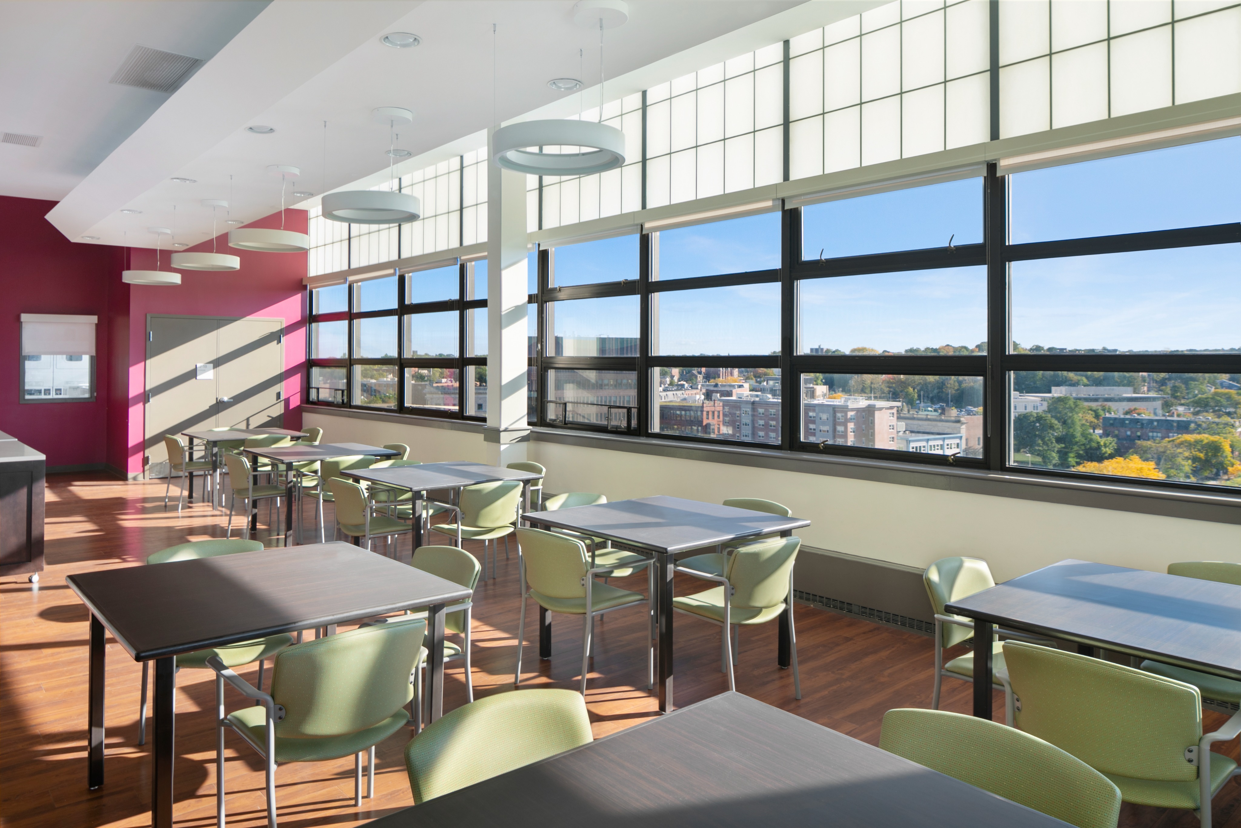 photo realistic add person walking near windows away from camera change nothing else