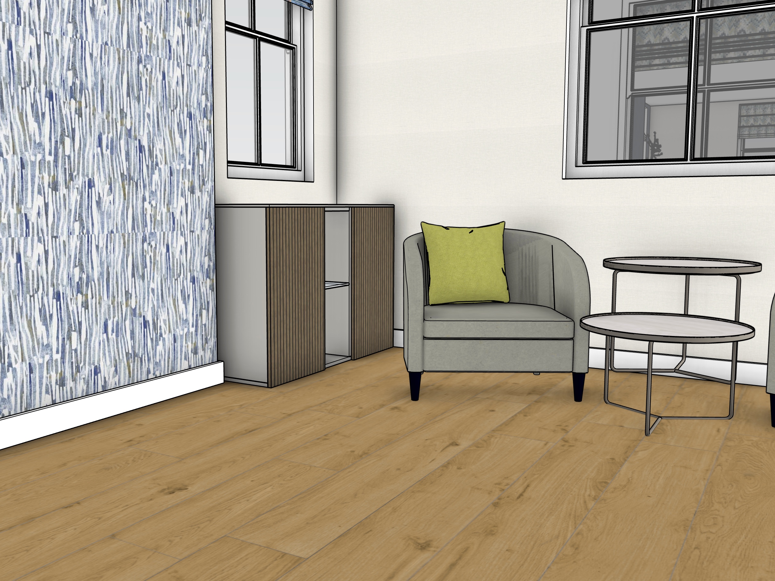 contemporary living room natural light rural view through windows sideboard with slatted wood doors and open section with glass shelf structure of sideboard in light grey don t add extra decor