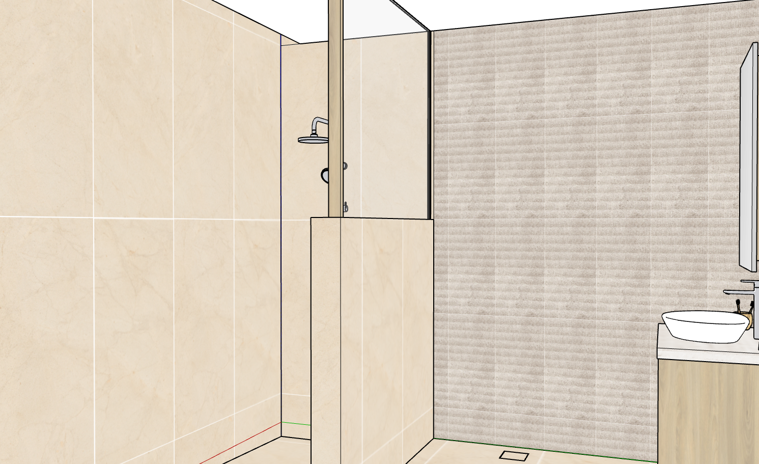 light beige floor and wall tile maintain tile texture feature wall beside vanity lower contrast strip lighting inside ceiling recess on upper left step on ceiling on upper left