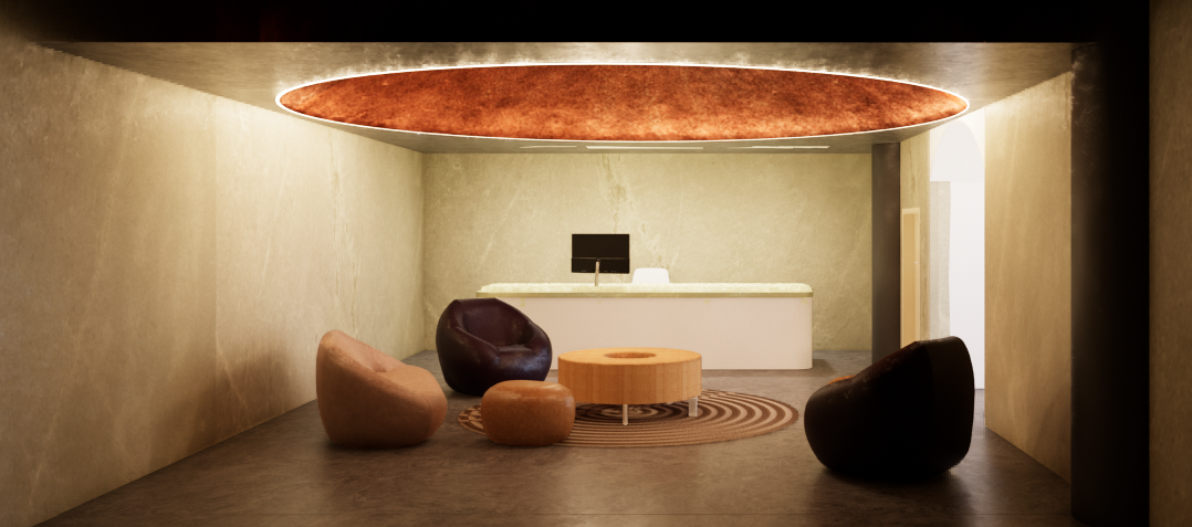 can you make the lighting look like cove lighting and change the materials on the welcome desk to something more welcoming also this is an office reception dek