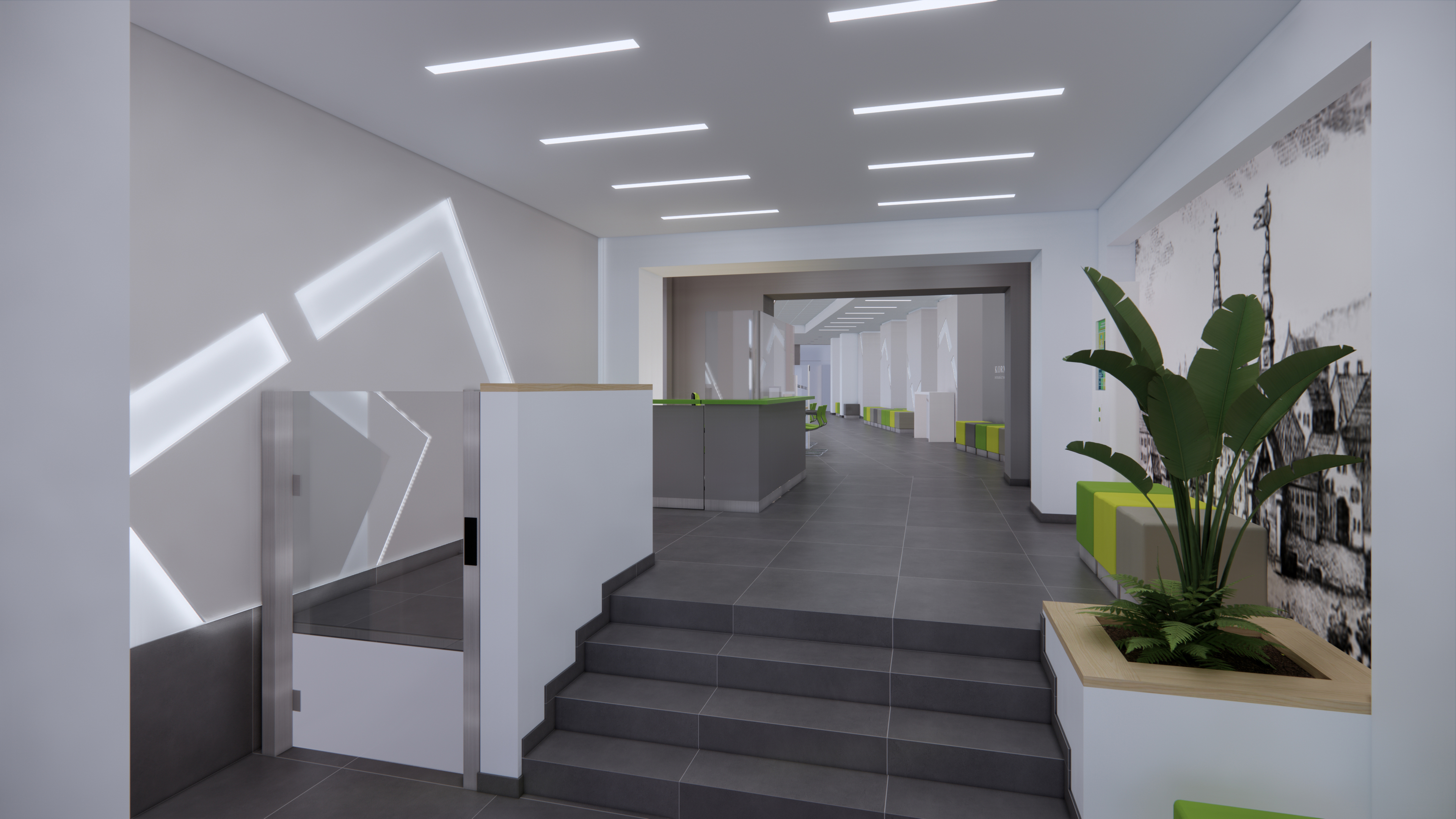 modern office lobby with a clean minimalist design the floor is grey gress tiles bright white ceiling panels with recessed lighting enhance the clean sophisticated look the counters are clean white with charcoal grey accents complete natural cool sun light comes in through the windows there are a few clients and office workers in the space