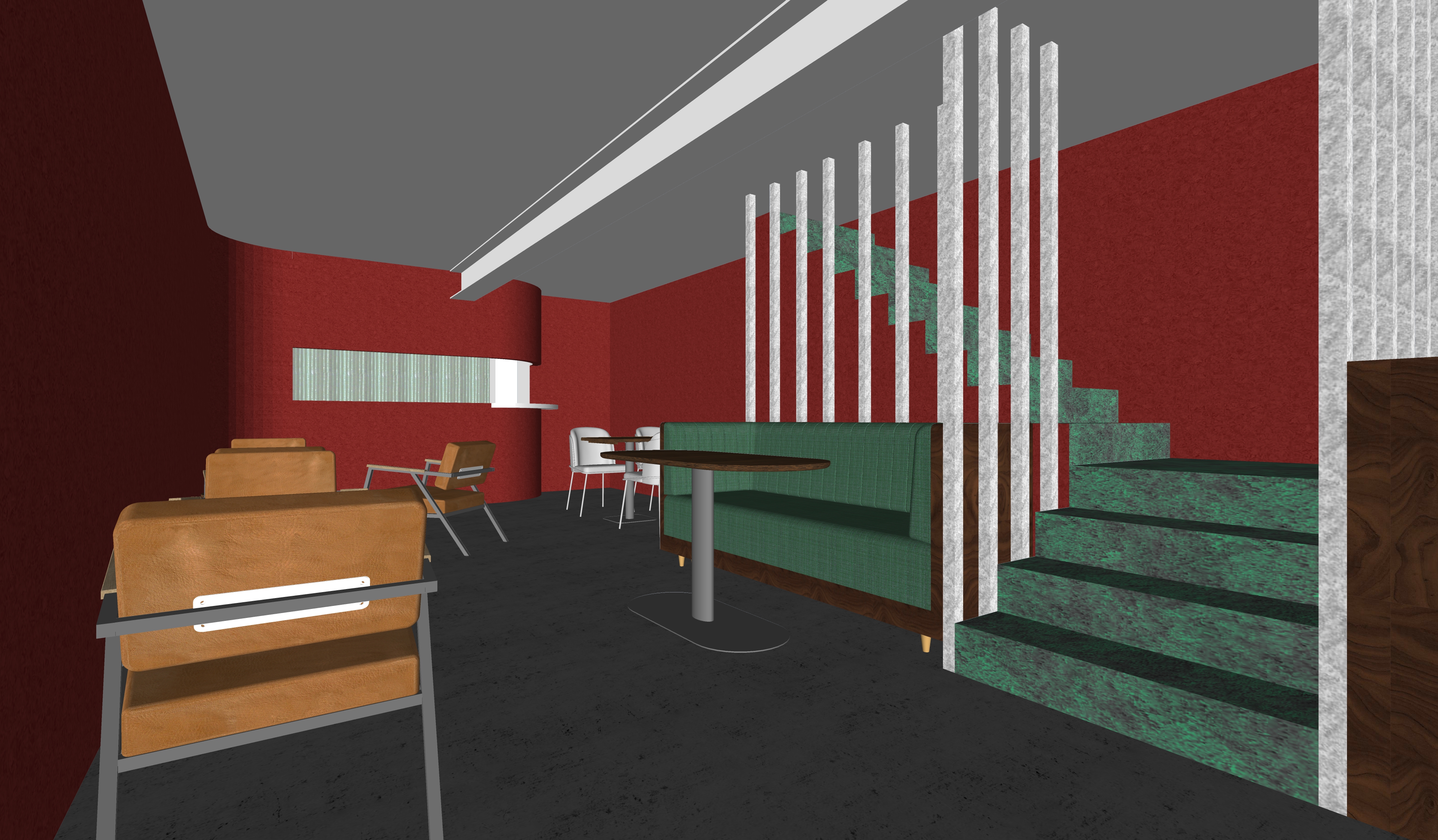 interior shot realistic render of japanese filipino noodle cocktail bar keeping the colors of burgundy walls and green marble stairs the floor should be gray or black terrazo architecture