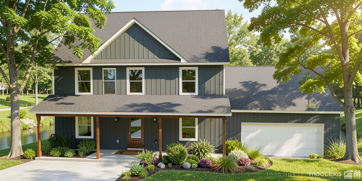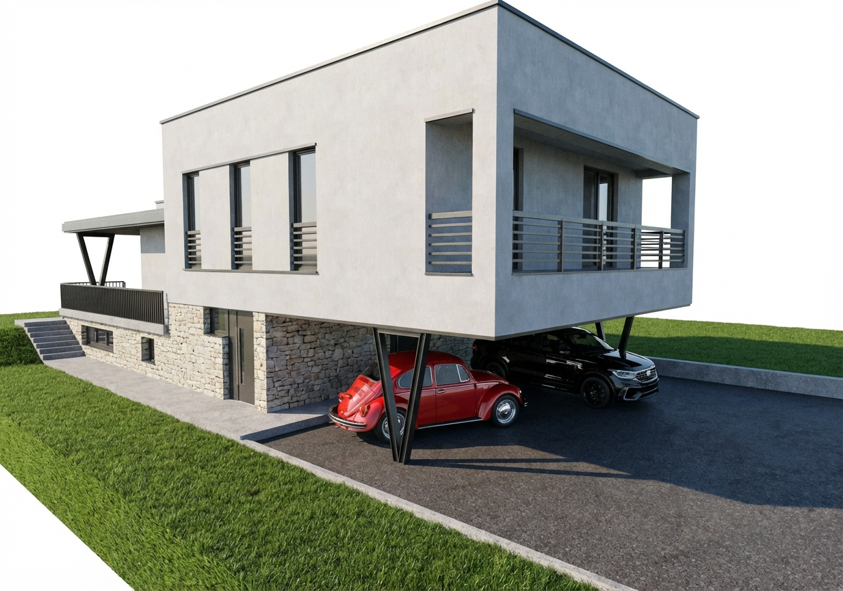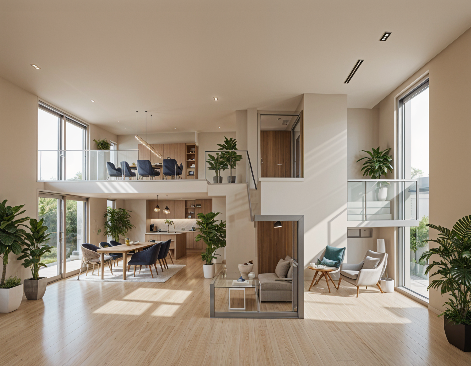 please make the dark grey cabinets a light blonde wood and the countertops have warm gold veining rather than gray add some floating shelves to the left of the tall cabinet on the far right