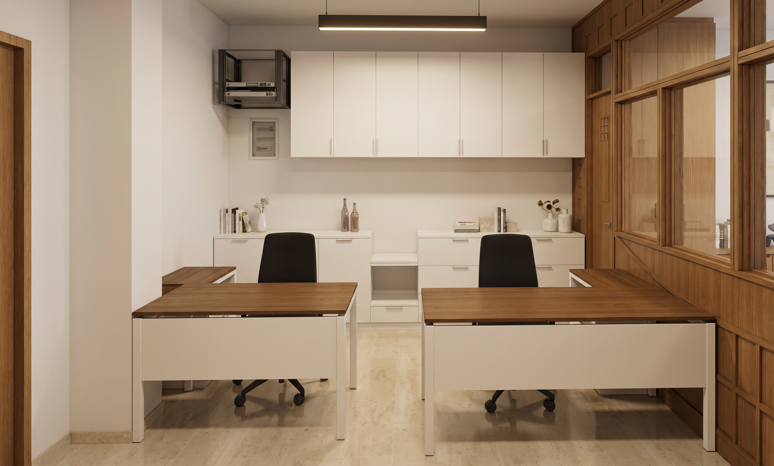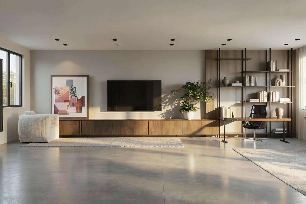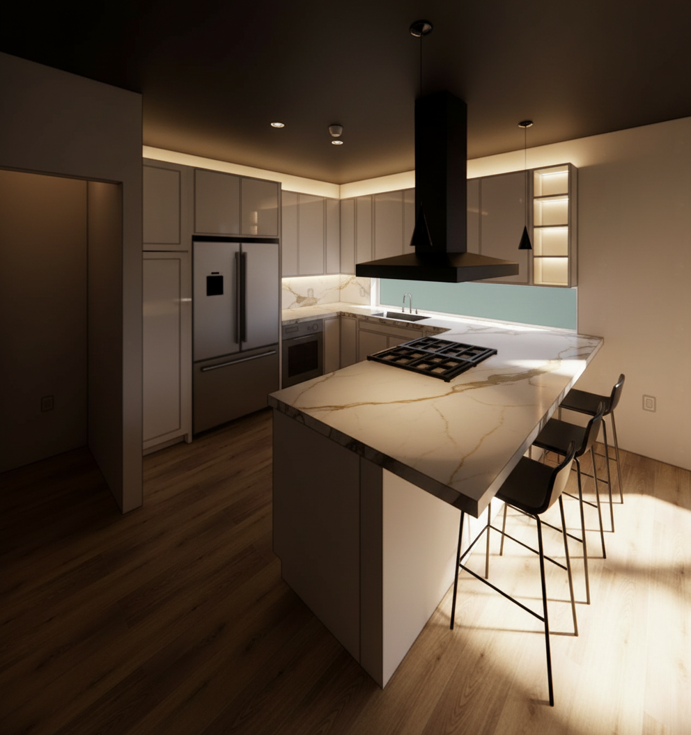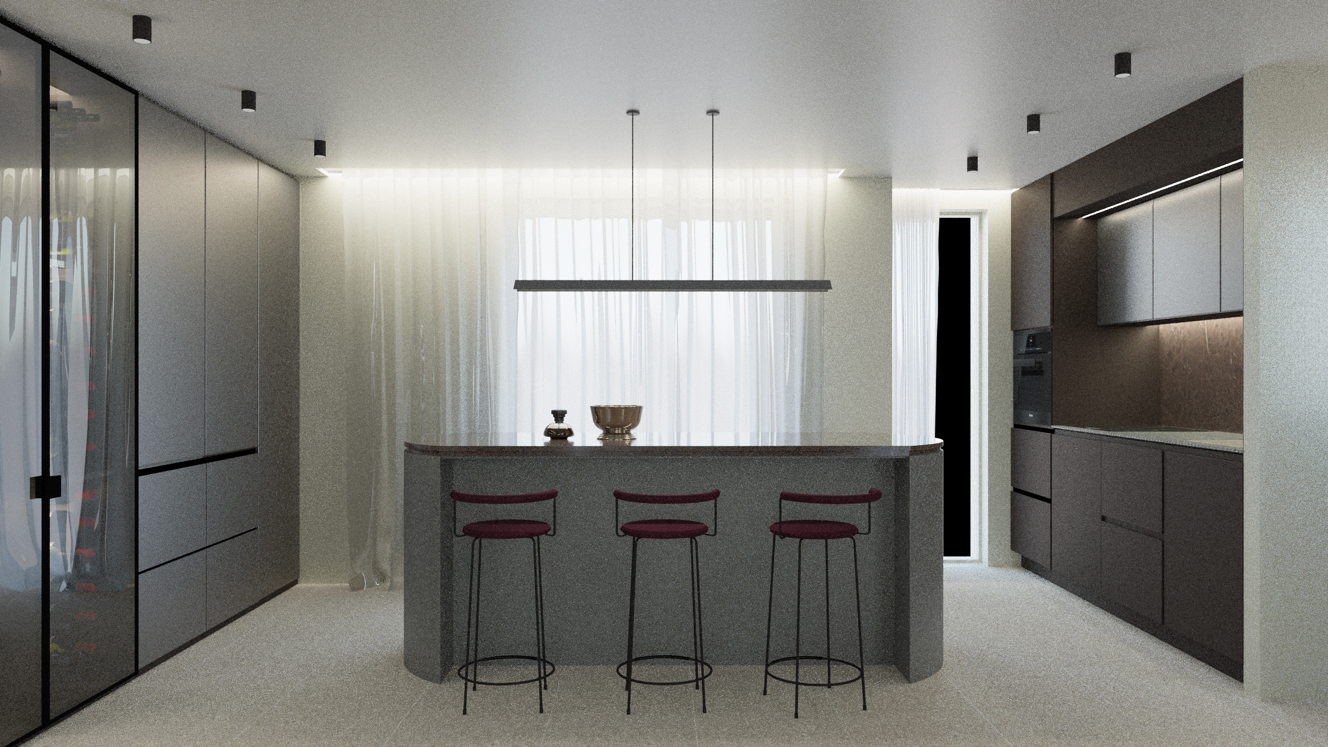 decrease noise make the glass at the wine cabinet transparent add at the wine cabinet hidden lights make the kitchen island concrete and the counter top a brown marble