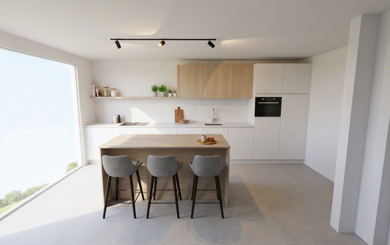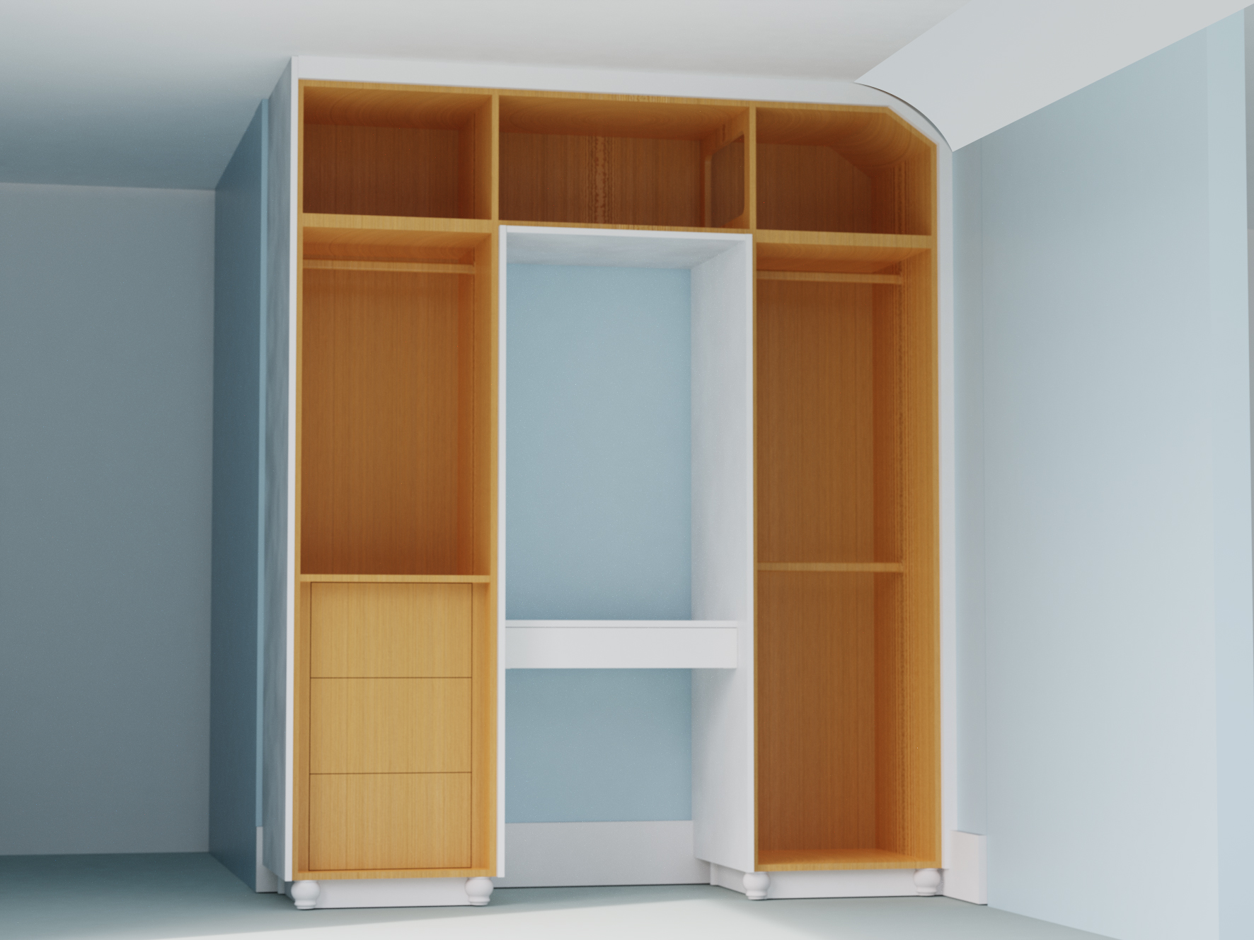 white oak interior wardrobe with white painted outside and a mid grey short pile carpet