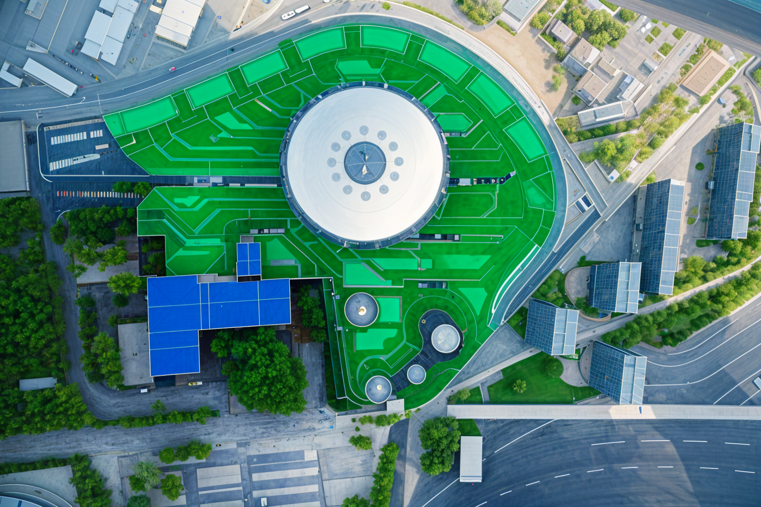 modern exterior shot don t change the image add beautiful green trees realism contrast details industrial area and city in the distance architecture