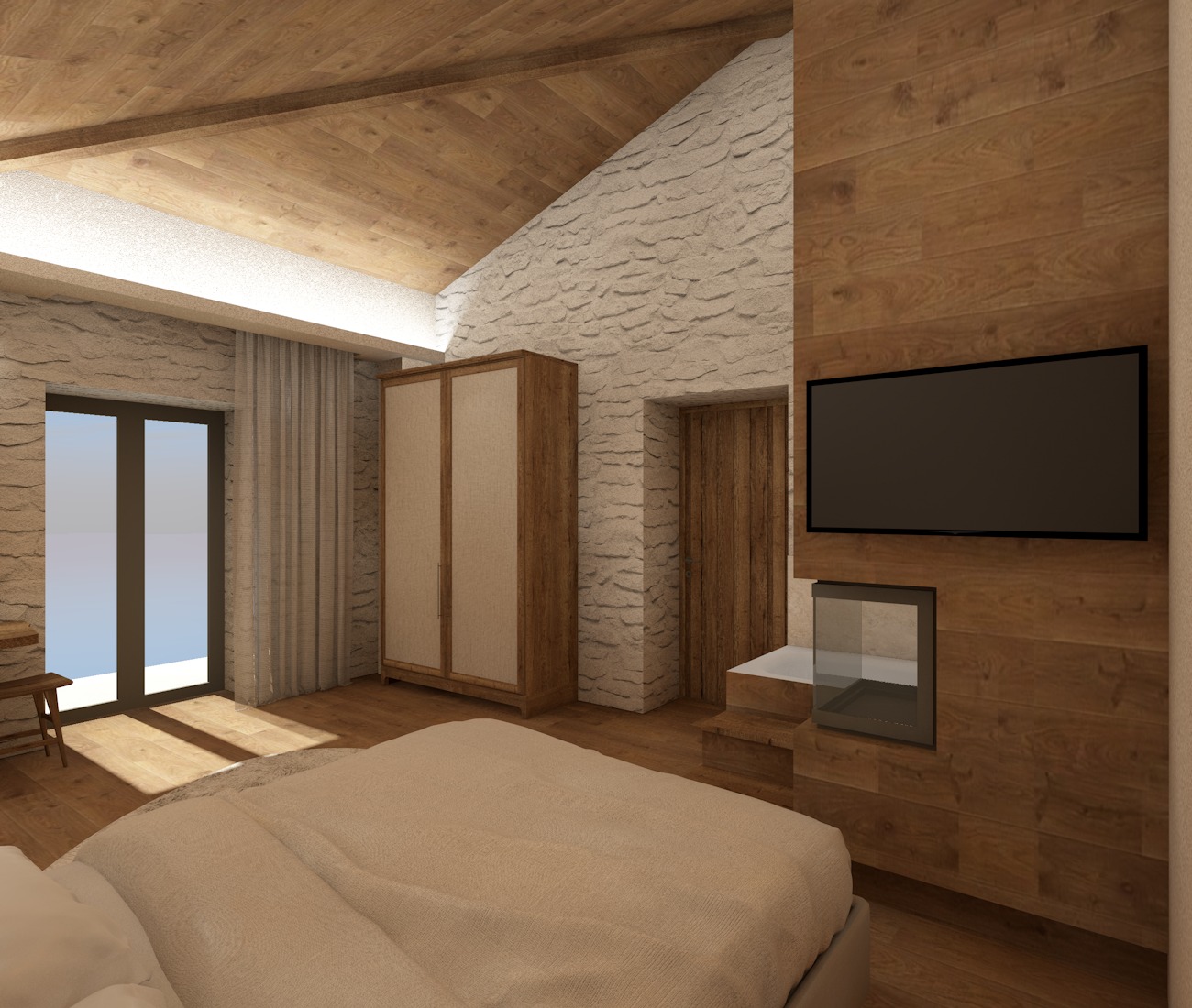 make the render more realistic outside of the existing window there is a balcony with a view of tall forest trees on the right side of the window there is a curtain on the left side of the window there is a stool do not change the size of the window add fire in the fireplace in front of the bed behind the fireplace there is a bathtub do not change anything else