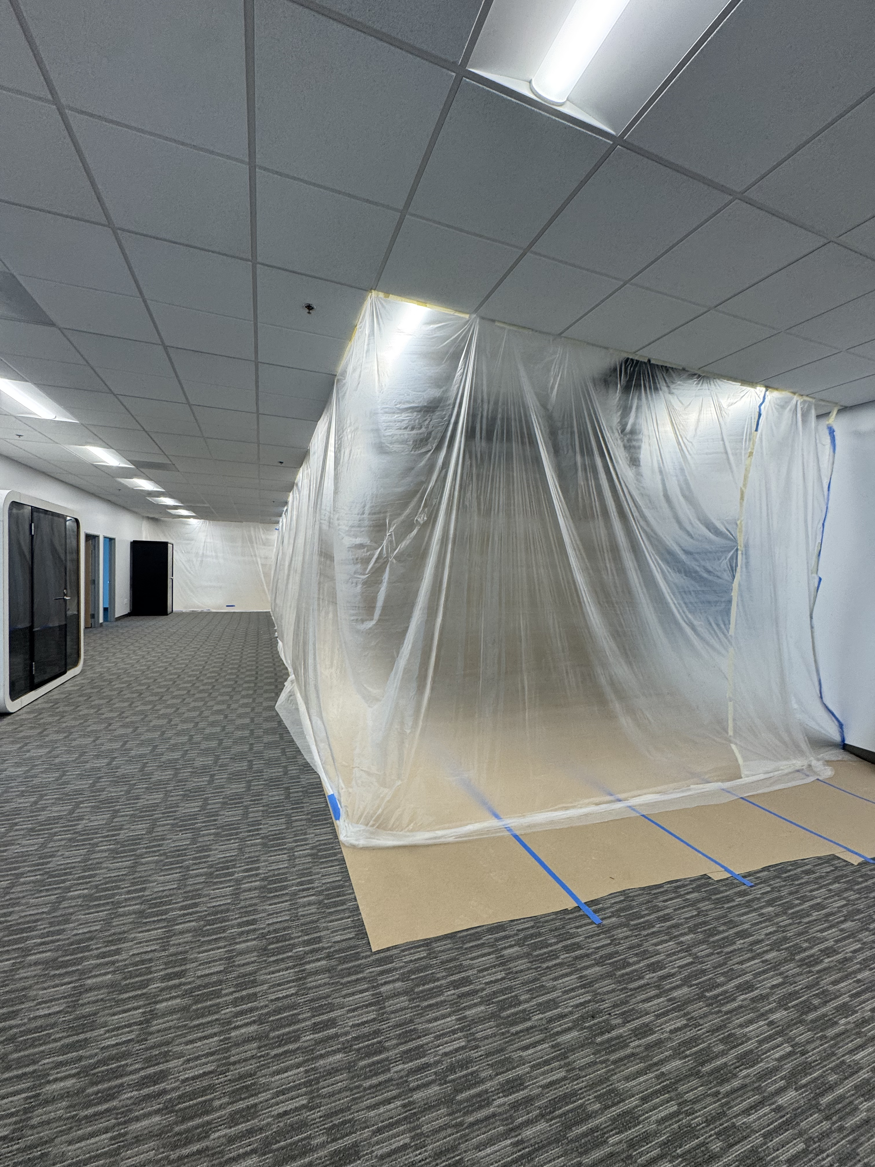interior shot make this photo realistic starting the from the flooring it should all be carpet but there should be a rug under the dining table the kitchenette cabinets should we an oak woodfinish all of the walls should be white except for the back wall is glass the wall beside the dining table should be a dark navy blue the sofa should be a dark navy blue as well the ceiling should be an office ceiling with rectangular led lights like the photo attached