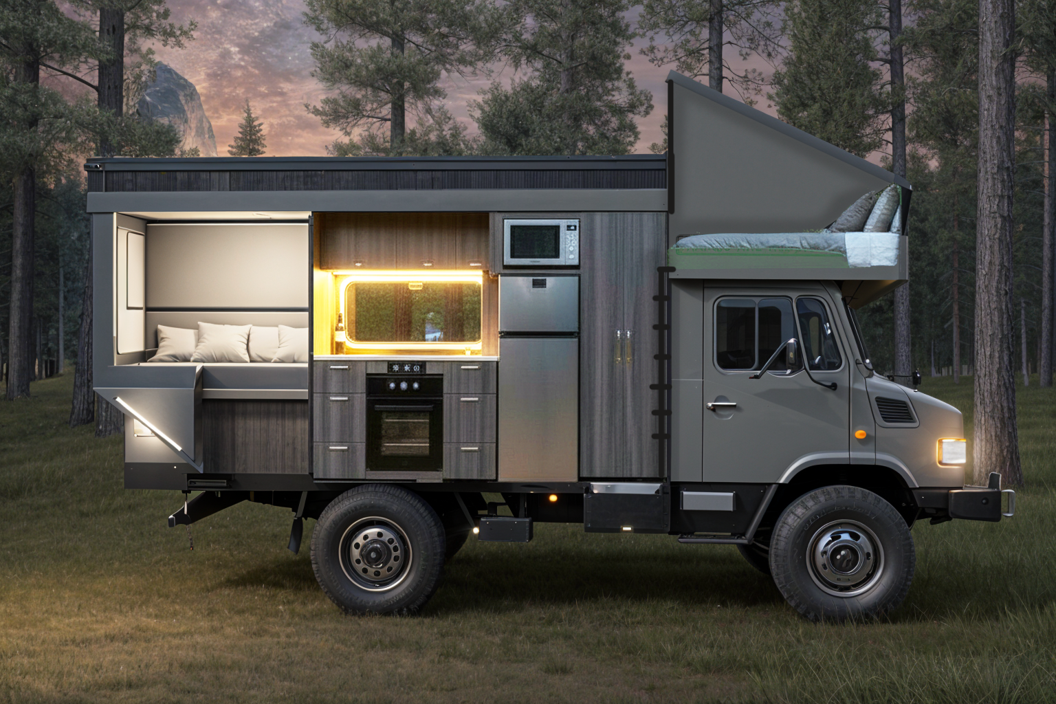 minimalism detail shot a beautifully rendered scene of an off grid camper truck with a roof bed parked in a serene forest one side is open revealing a cozy interior illuminated by warm golden lighting inside there s a plush seating area with soft gray cushions complemented by stylish wooden cabinetry in a dark espresso shade housing a compact stainless steel kitchen setup the sky is a twilight blue with twinkling stars emerging evoking a sense of tranquil adventure and freedom architecture