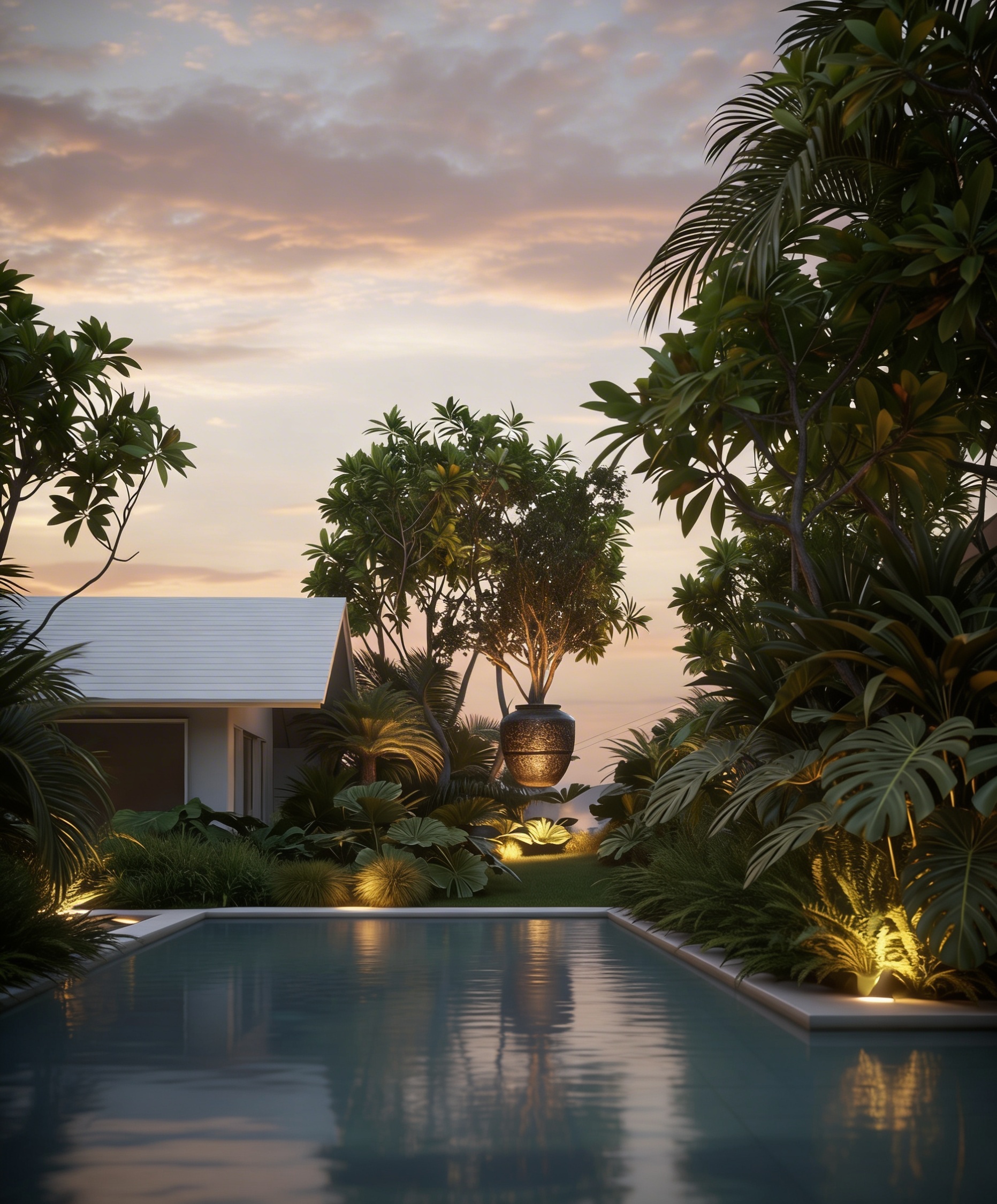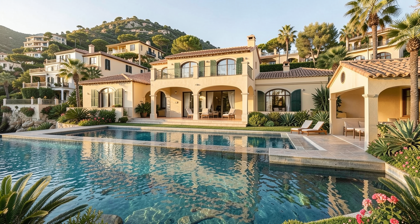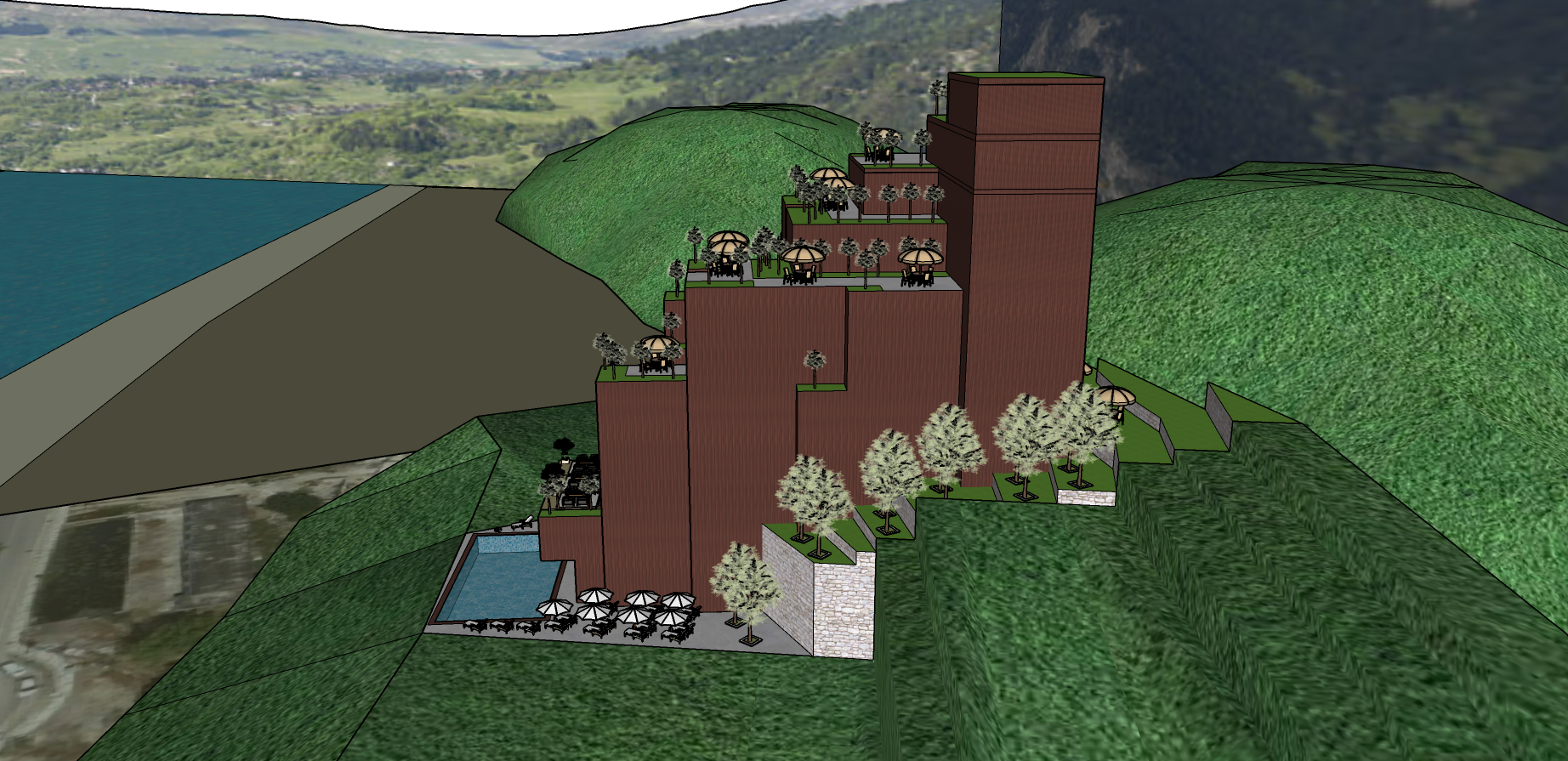 render a stunning architectural resort nestled in lush green mountains featuring cascading terraces with modern structures in deep purple tones put large tall and wide glass doors overlooking the terraces and also many windows in all the walls windows and doors have to prevail over the facade each terrace is adorned with vibrant green lawns and elegant parasols in soft beige the surrounding trees are a mix of muted silver and deep green foliage incorporate a luxurious inviting pool at the base with clear blue water the atmosphere exudes tranquility and harmony with nature with soft natural lighting emphasizing the serene setting please fill the surrounding hills with olive trees and some houses make it an elite residential zone notice that there is the sea on the left of the picture