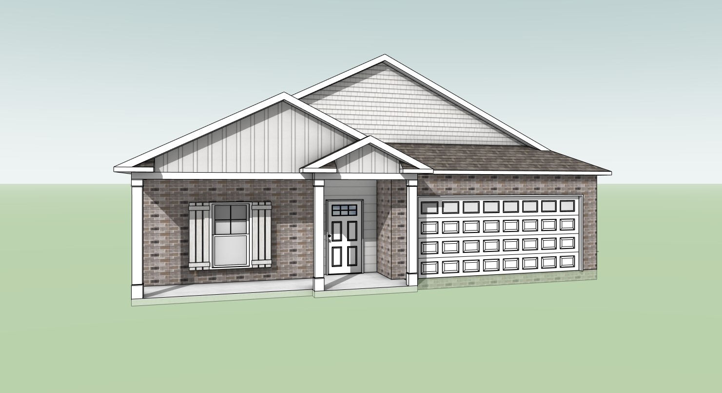 exterior shot neighborhood backrground with a driveway on the right and landscaping on the left clouds and trees in the background