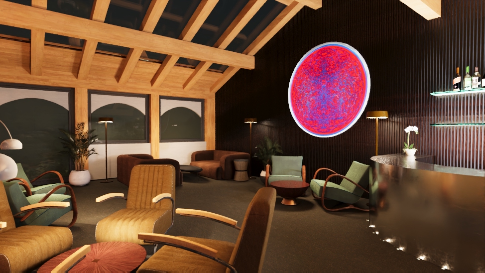 allunga verso sinistra il banco bar argento che si vede sulla destra sino alla parete in legno e vetro