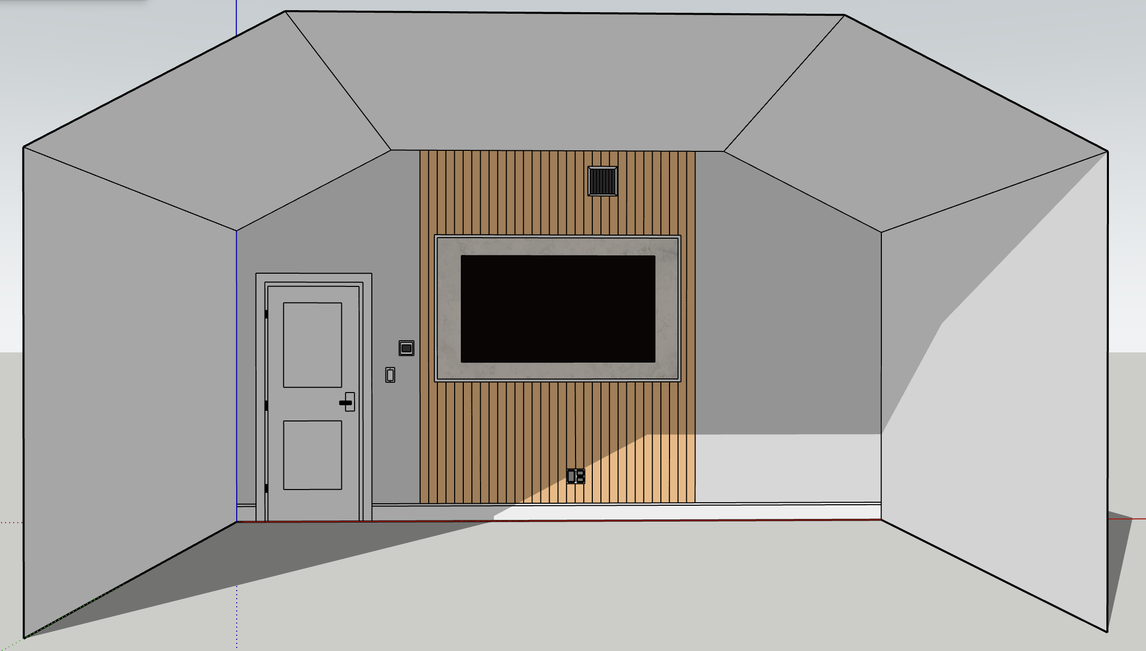 turn this 2d sketch up rending into a realistic photo this is a media wall concept that includes wooden acoustic panels a faux marble background installed behind the tv with warm white led light emitting from behind the marble background