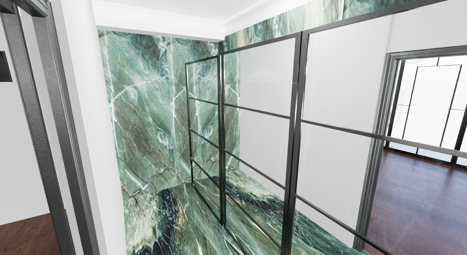 shower door is mirror change tile to while murble