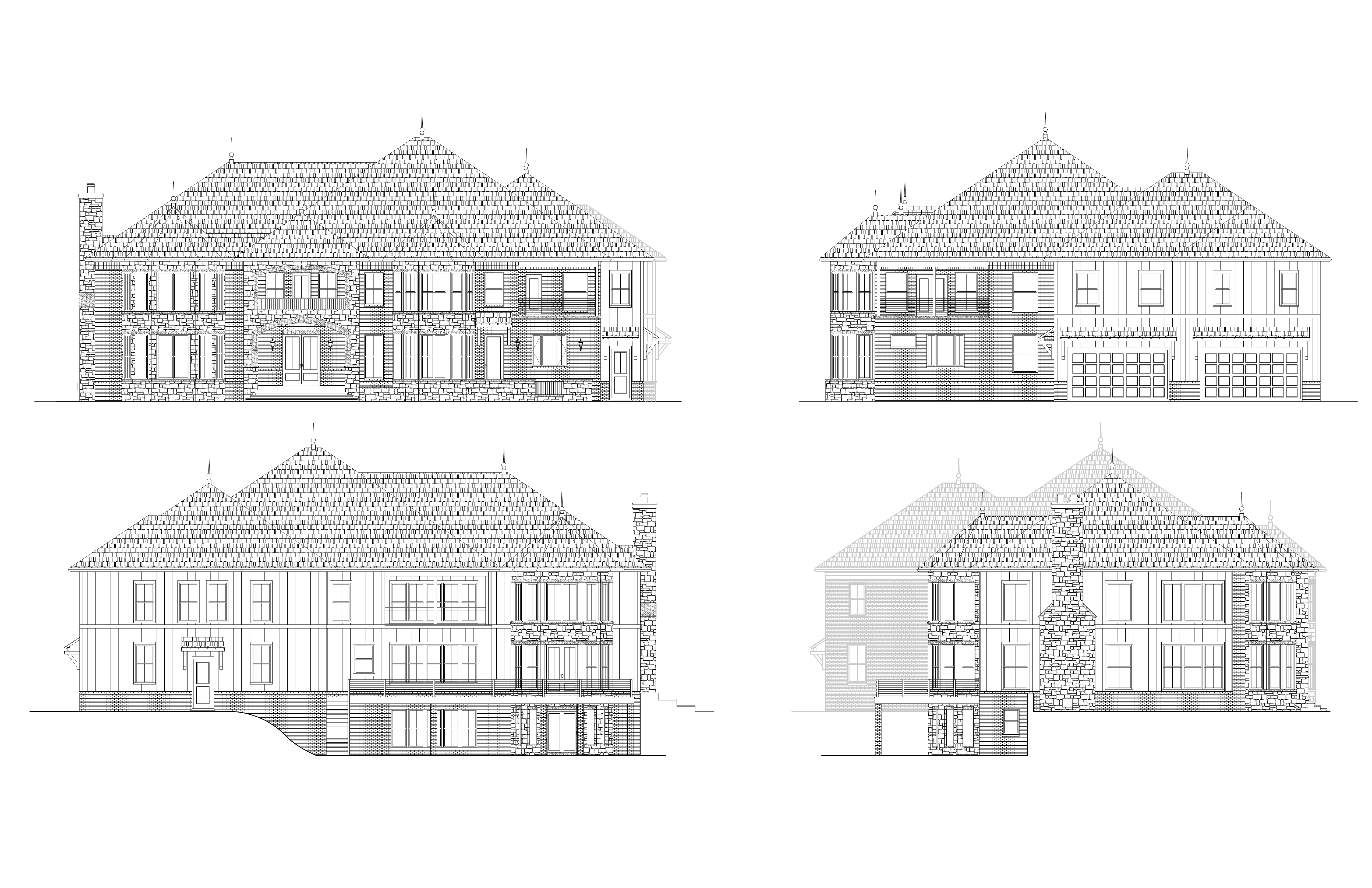 a picturesque two story house with a soft gray facade and a dark grey slate sloping roof large windows framed in black contrast the structure elegantly a spacious welcoming entry extends from the front featuring muted gray railings and light wood accents square chimney rise from the roof complementing the overall design the atmosphere is calm and serene bathed in the delicate warmth of a golden sunset casting gentle shadows a touch of warmth with a softly lit entrance door in a mahogony wood invites a homely feel the sky is a gradient of soft pastels enhancing the tranquil setting