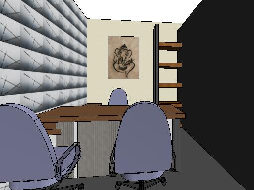 render an elegant md office interior with a white based background and a clean minimal aesthetic include a frosted glass partition on one side to maintain privacy while allowing diffused light the back wall should feature a subtle vastu friendly ganesha art in a refined contemporary style placed on a white wall background use soft indirect lighting premium materials and a modern executive desk setup ensure the overall environment feels calm sophisticated and executive grade