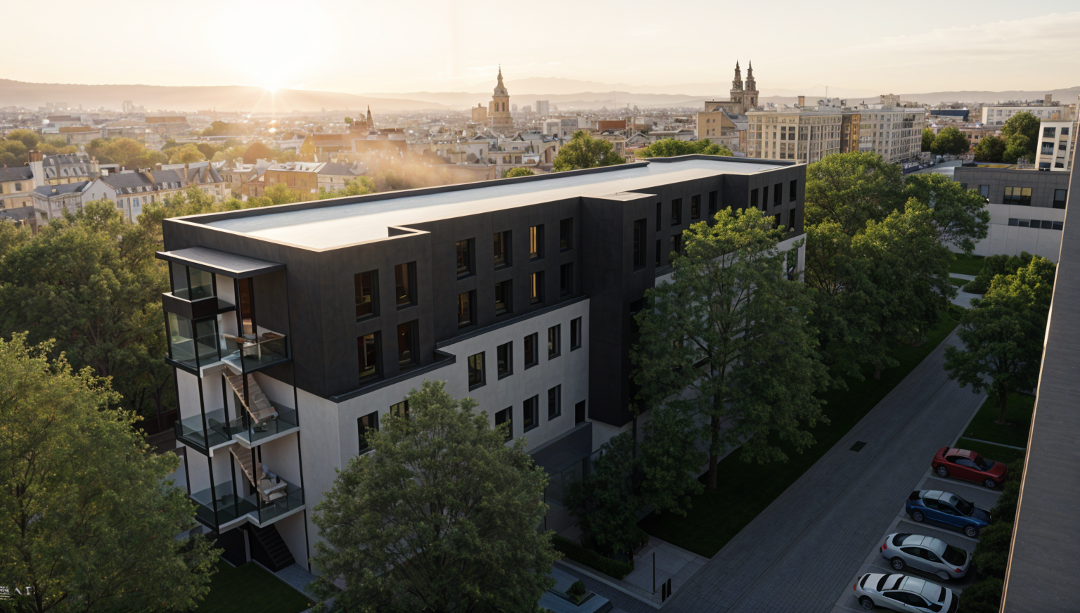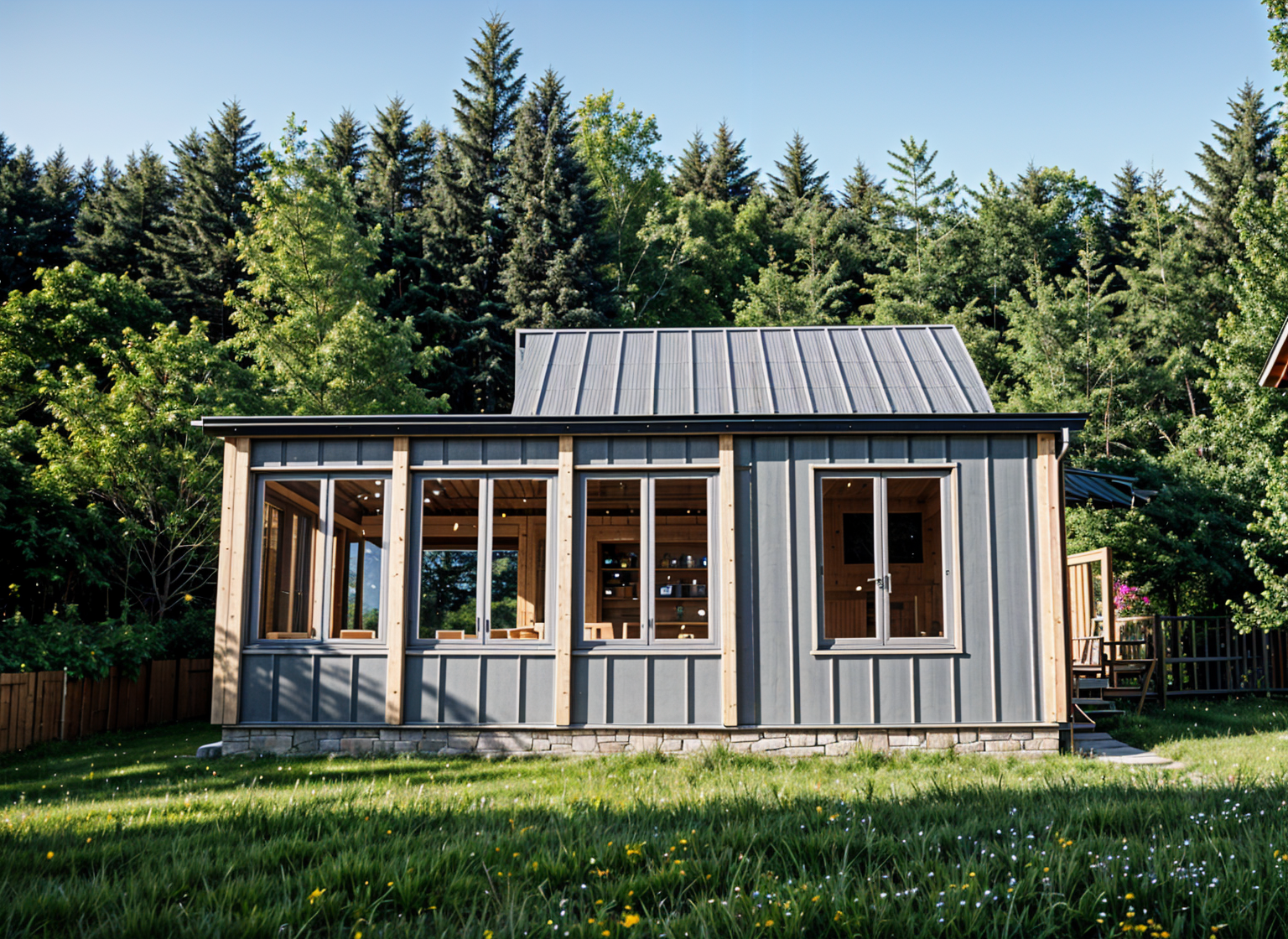 exterior shot add half horizontal grey metal blinds to the front of windows architecture