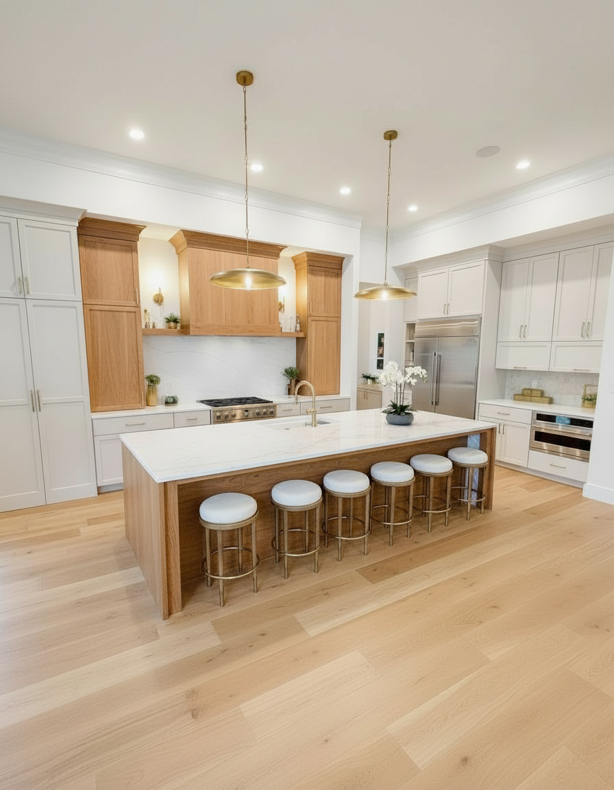 add glass fronts to the far right side upper cabinets change those cabinets to medium tone clear alder to match the other wood cabinets