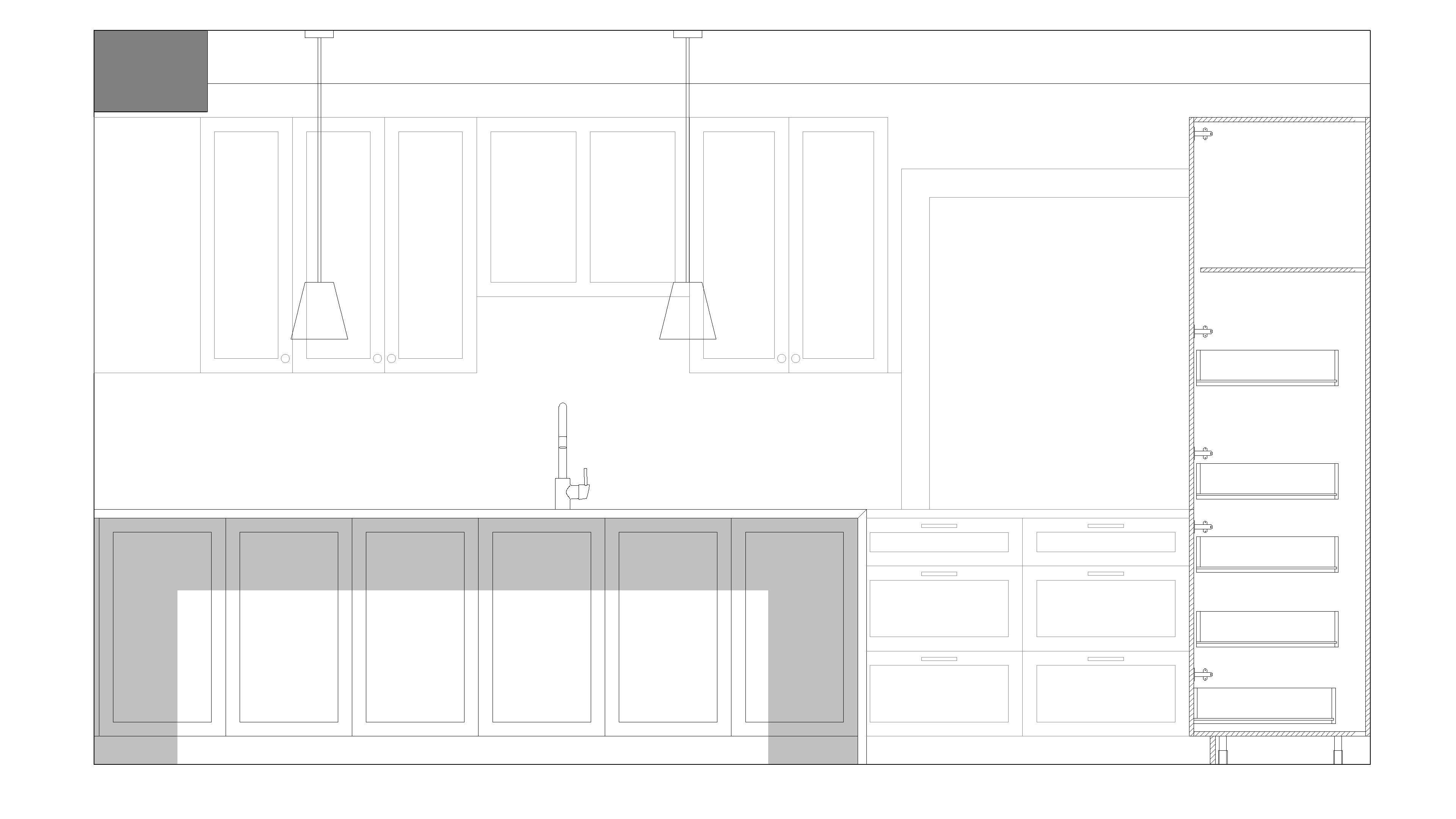 cuisine avec dosseret en carreaux de c ramique portes d armoires shaker blanche en haut et gris pale en bas poign es d armoire noir mat lectos m nager en acier inox meubles en coupes au devant droite et gauche grande fen tre sur for t droite cuisiniere et four micro onde