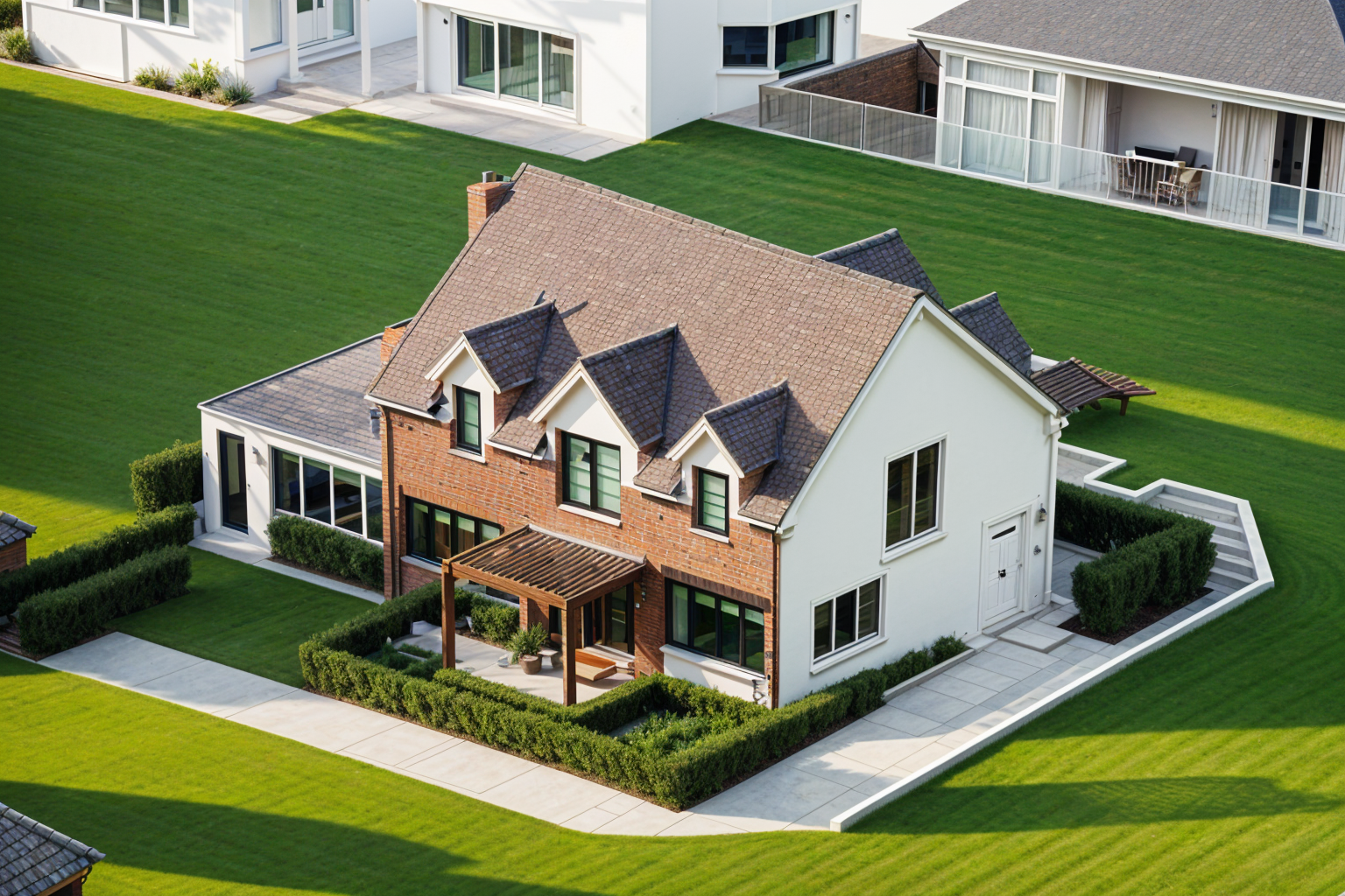exterior shot modern victorian elements and some white facade bricks white facade white walls surround the house with a lush green lawn wine red roof architecture
