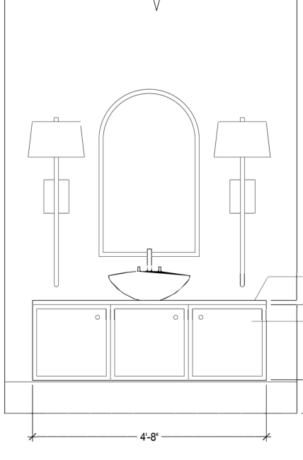 walnut floating vanity with honed soapstone countertop vessel sink arched gold mirror centered over sink sconces are antique brass with linen shades oak floor with urbane bronze wall color no back splash