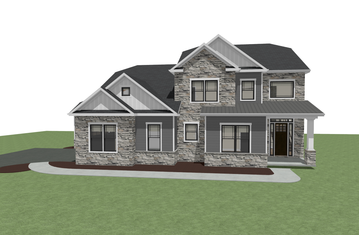 render this 3d image to appear photo realistic maintain all existing architectural materials and structural elements exactly as shown enhance the setting with a lush well maintained landscape include minimal beds manicured shrubs and a tree lined backdrop that frames the home naturally the windows should have a glossy finish with clear reflections of the surrounding trees and sky lighting should feel natural with soft shadows and realistic depth to bring the scene to life