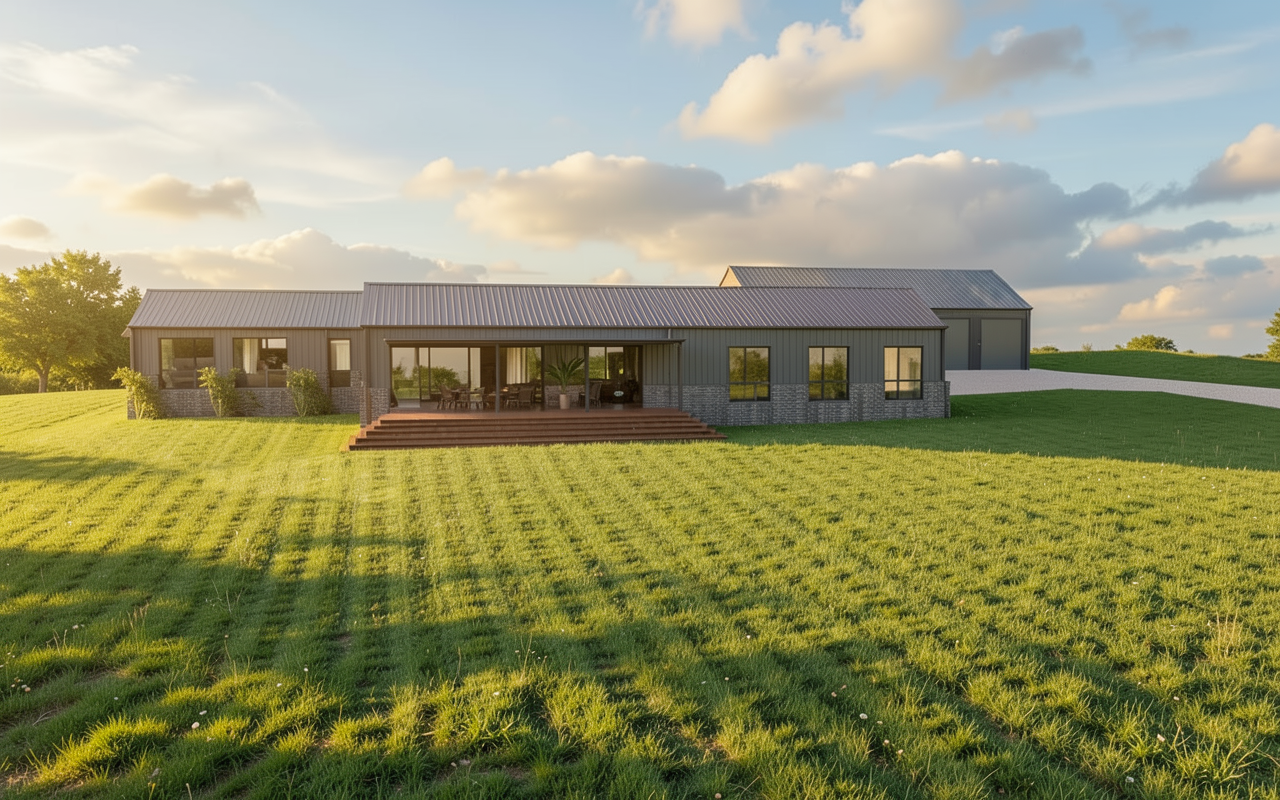 a manicured lawn lots of australian eucalyptus trees in the background and the foreground australian native ferns and plants and native shrubs and native plants stone pathway leading to the entrance an outdoor kitchen entertaining area with seating to the left front with a sloped roof and a straight parallel pathway to a square firepit children playing more large native australian eucalyptus trees everywhere a wallaby an eagle a small square swimming pool with glass pool fence next to entertaining area with a bikini girl