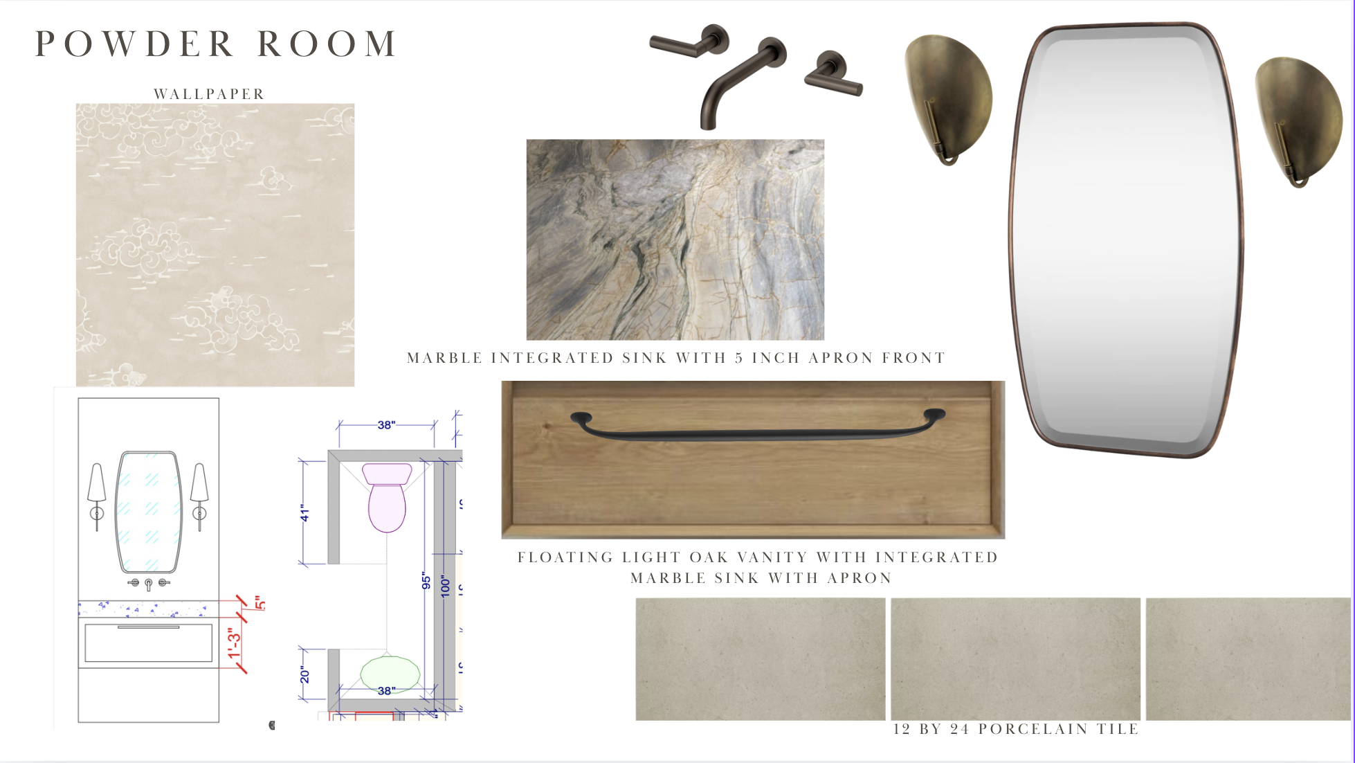 use elevation and floor plan to render a view of the bathroom vanity room view side walls must touch both sides of 38 inch vanity use design elements from mood board including beige wallpaper specific marble for vanity