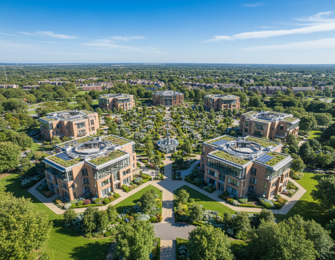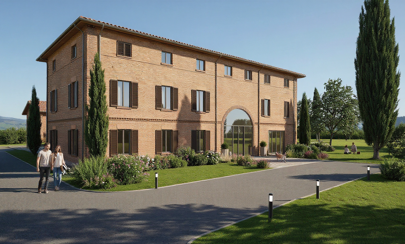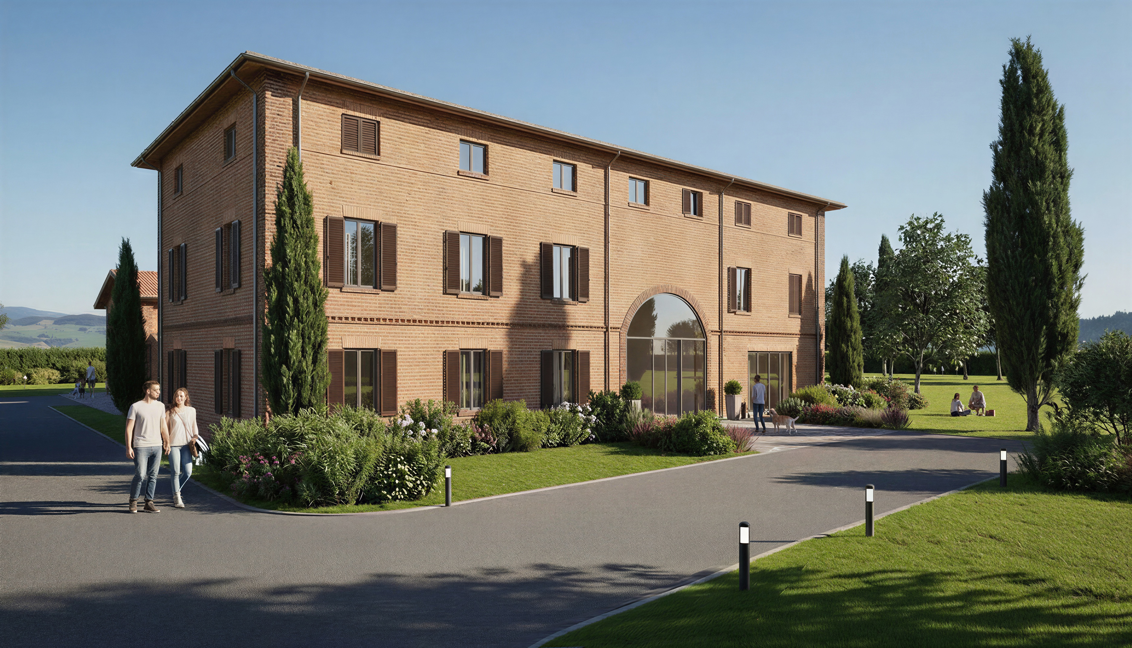 create a beautiful scene of an elegant countryside villa with rustic red brown bricks and a terracotta roof surrounded by lush vibrant green lawns and trees the atmosphere is serene and peaceful with a clear blue sky and soft natural sunlight casting gentle shadows the paved driveway should be a smooth muted gray lined with neatly trimmed grass and ornamental plants with soft purples and pinks add slender elegant cypress trees for a touch of mediterranean charm