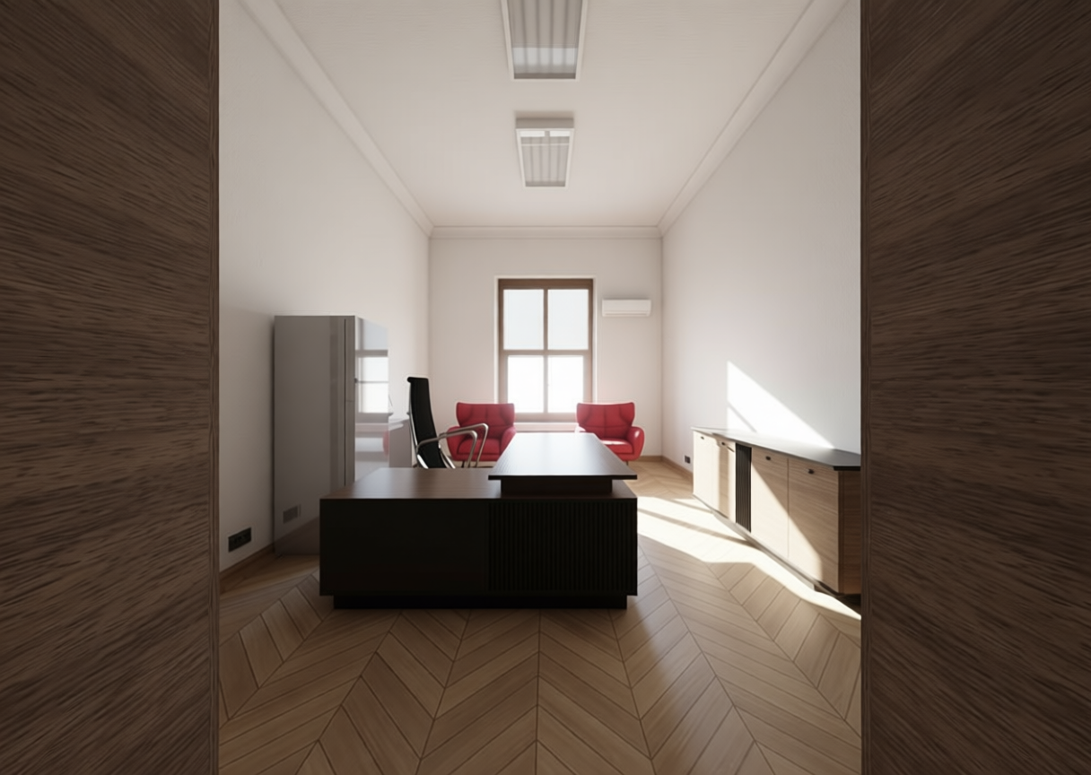 you are working with an existing set of base renders of a fully modeled office interior the architecture and primary furniture are already placed correctly your task is to virtually stage the scene by adding decorative elements functional office equipment and subtle styling enhancements while preserving the original design strict constraints do not modify the architectural elements walls floors ceilings windows structural components do not move replace resize or remove any existing furniture do not alter the layout or camera composition only add elements and enhance materials lighting and styling do not rely on or reference any external images references or mood boards apply changes in a way that is consistent and reusable across multiple renders furniture color adjustment identify upholstered seating elements that are currently pink chairs and sofa recolor all such elements to a muted mauve tone the mauve should be soft desaturated dusty purple with warm undertones matte or slightly textured fabric physically realistic with preserved folds seams and shading ensure the recolor blends naturally with lighting and surrounding materials do not alter the form material type or geometry of the furniture only the surface color virtual staging elements to add 1 desktop workstation accessories subtle realistic computer setups monitors keyboards mice where appropriate desk organizers pen holders notebooks trays minimal office supplies papers folders stationery cables managed cleanly and discreetly 2 decorative objects small curated decor items such as vases sculptures or design objects books arranged neatly on tables or shelves subtle personal accents that maintain a professional tone 3 plants biophilic elements indoor plants of varying sizes desk plants medium floor plants use realistic planters ceramic concrete or matte finishes distribute plants to soften corners and add visual balance 4 wall decor minimalist framed artwork or abstract prints neutral contemporary compositions that complement the office environment maintain balanced spacing and alignment 5 lighting elements decorative not structural changes add table lamps or floor lamps if they logically fit within the scene ensure they are consistent with existing lighting conditions and do not override them 6 textiles soft details optional subtle additions such as cushions or throws only if consistent with the furniture context maintain a restrained professional aesthetic material realism enhancement improve material definitions subtly softer fabric response for upholstery realistic reflections for glass metal and polished surfaces fine micro textures for wood fabric and painted surfaces maintain consistency across all similar materials lighting enhancement preserve the existing lighting setup enhance global illumination slightly for a more natural and cohesive look ensure soft realistic shadows balanced exposure no overexposed highlights or crushed blacks maintain a neutral to warm professional interior lighting tone color grading apply subtle global color grading slight warm neutral balance controlled contrast mild desaturation for a refined modern editorial look ensure all added elements harmonize with the overall palette consistency requirement all staging elements must feel like part of a unified design language across all renders maintain repetition of style materials and object scale where applicable final goal a fully staged office interior render that preserves the original architecture and furniture layout includes thoughtfully placed decorative and functional elements features mauve upholstered seating replacing original pink tones exhibits a cohesive modern realistic and professionally styled atmosphere
