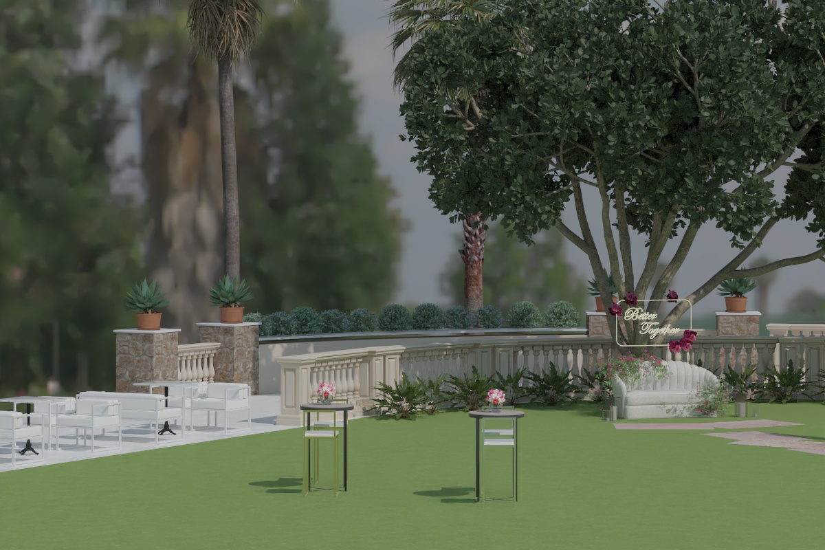 add fairy lights to the tree add flower arrangements at the right and left hand of the sofa the arrangements must be exactly next to the sofa with fuschia bougainvilleas and yellow roses make the arrangements look like two semi arches make them much smaller and remove the third arch make the arches even smaller and lower make the arches even smaller in size and add a bit of yellow flowers