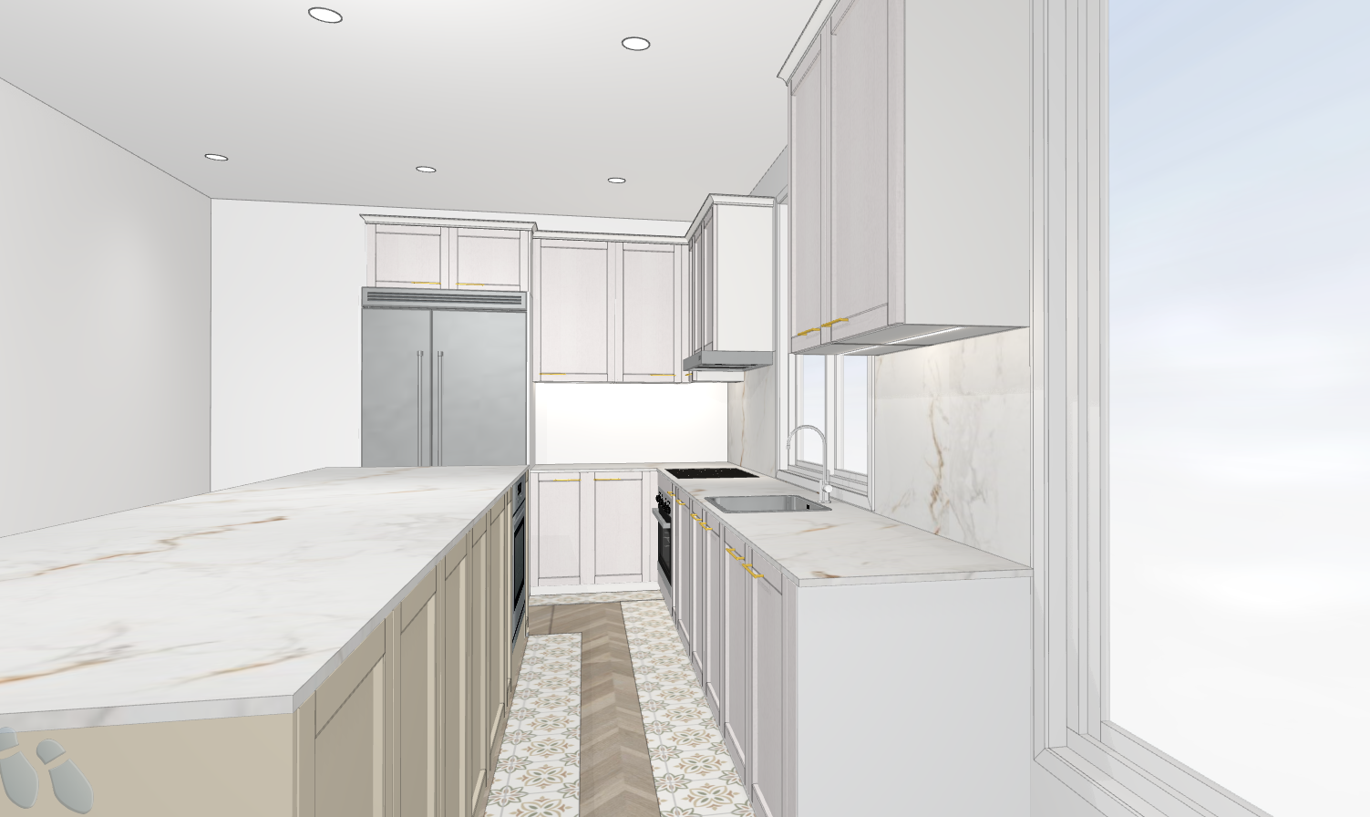 elegant white kitchen cabinetes of the island are cream color and the rest of the kitchen is white