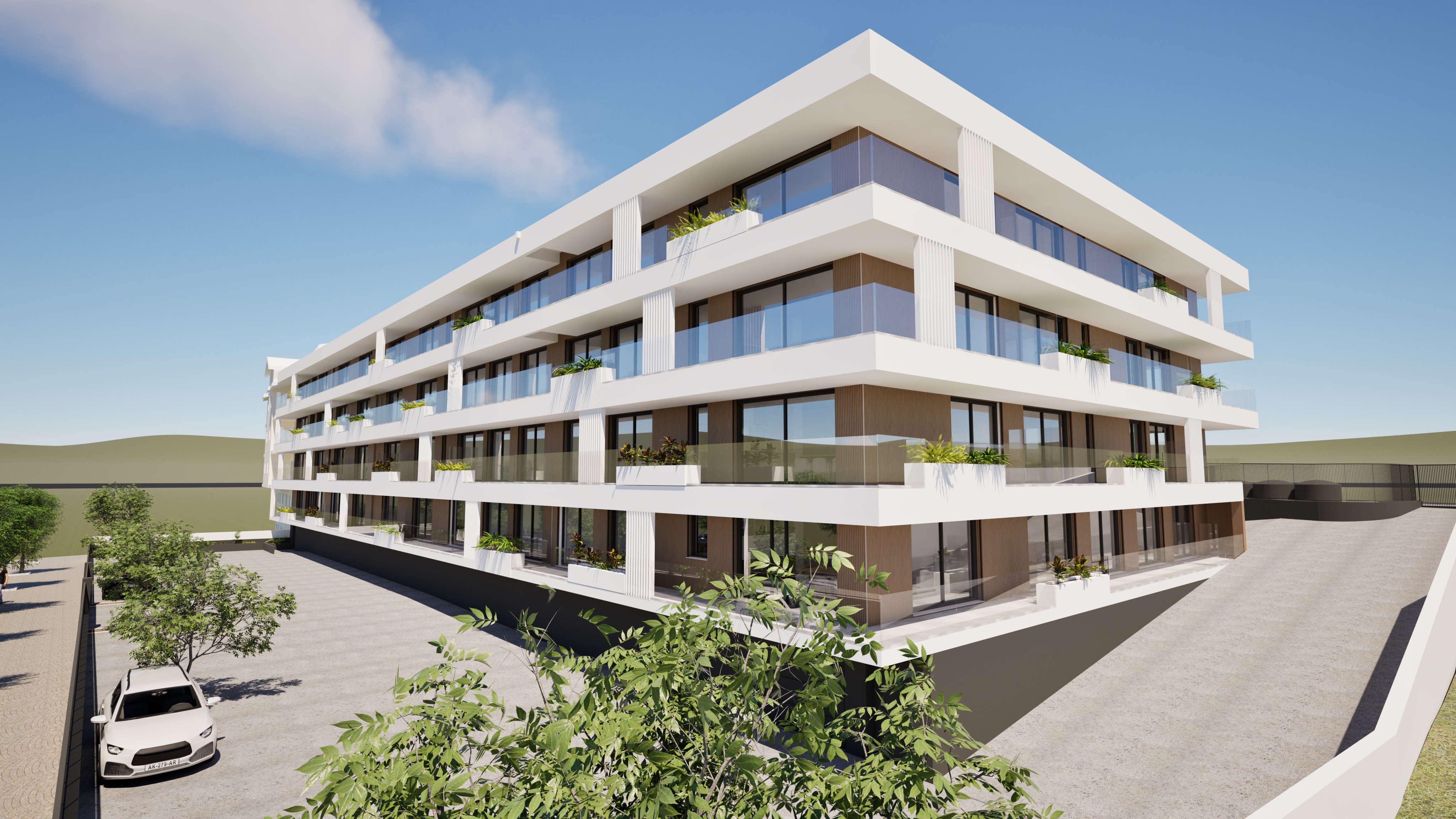 pensa como arquiteto e cria uma fotografia ultra foto realista deste render sendo que o ed ficio novo coloca o c u com umas nuvens ligeiras retira o carro