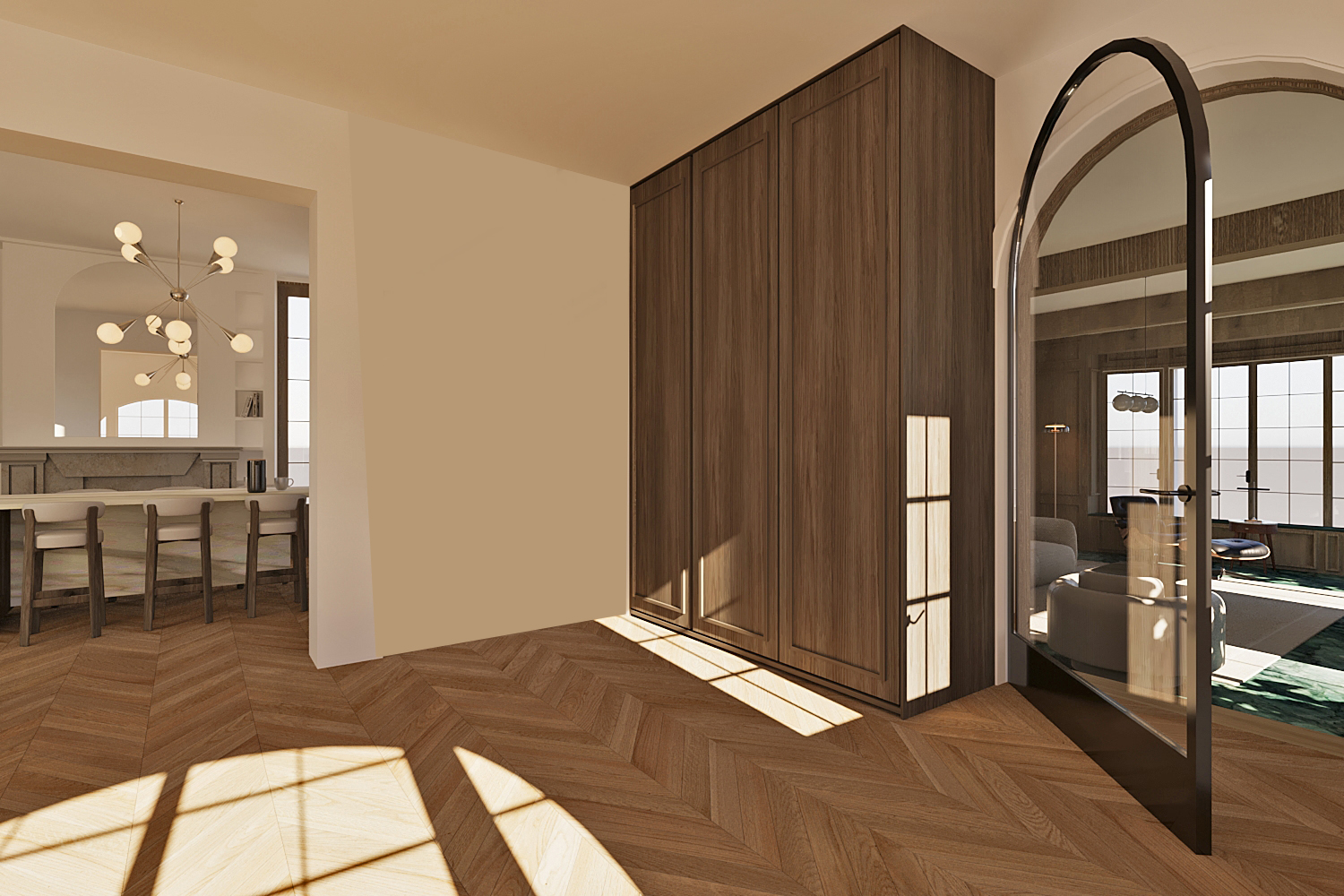 delete the big wood closet against the wall and instead put a big arched mirror and some shelves and books put a round sofa with a round carpet and a little wood table and a big arched mirror against the wall and some frames