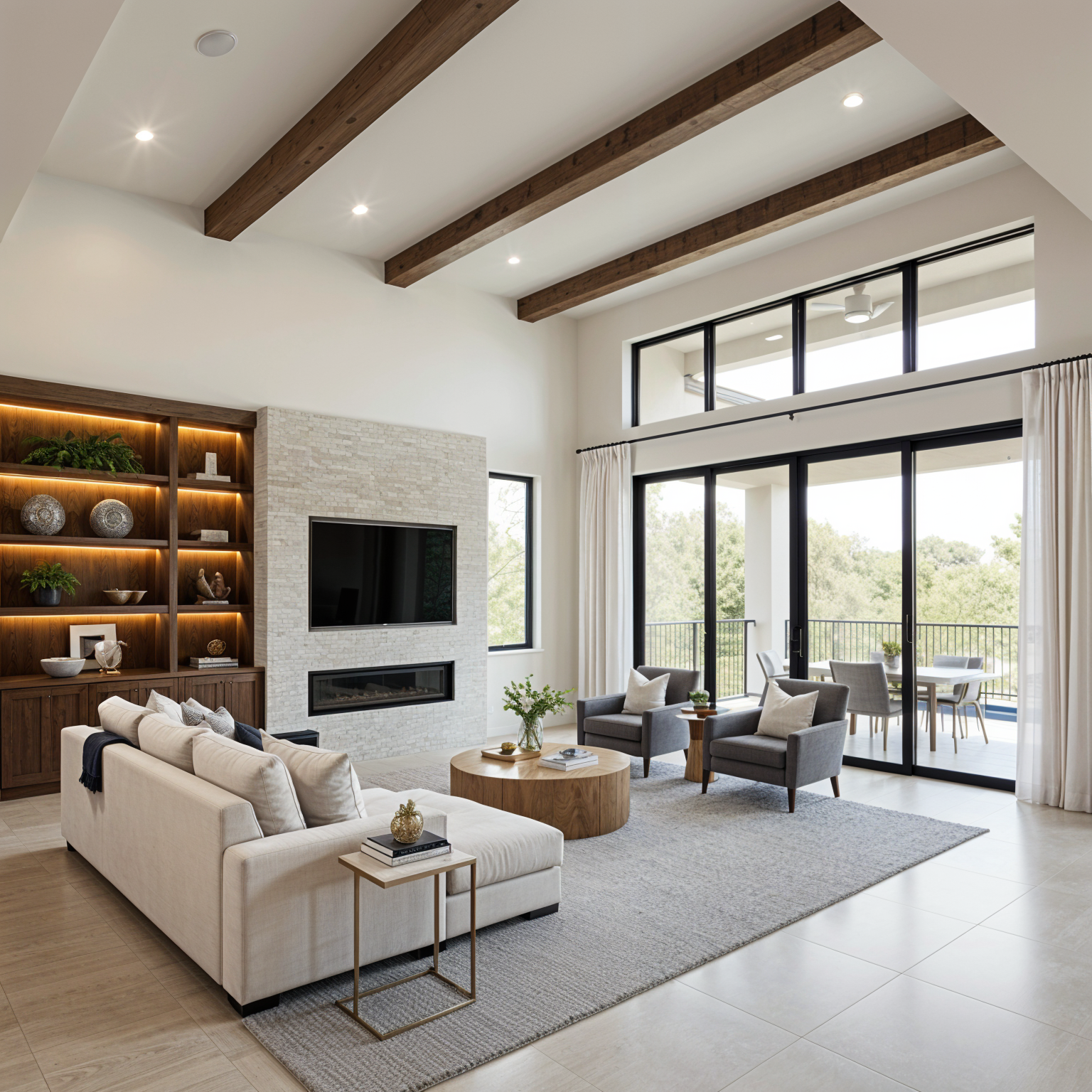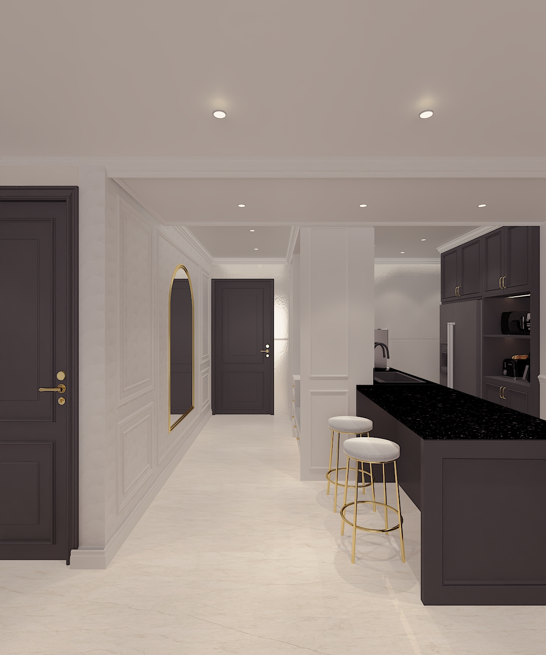 do not change any design or layout from the existing image white paint doff wall panels and ceiling with black doors and black kitchen with black gold glossy granite top table flooring using beige glossy marble finish with fine pattern in it create a general modern classic design ambiance