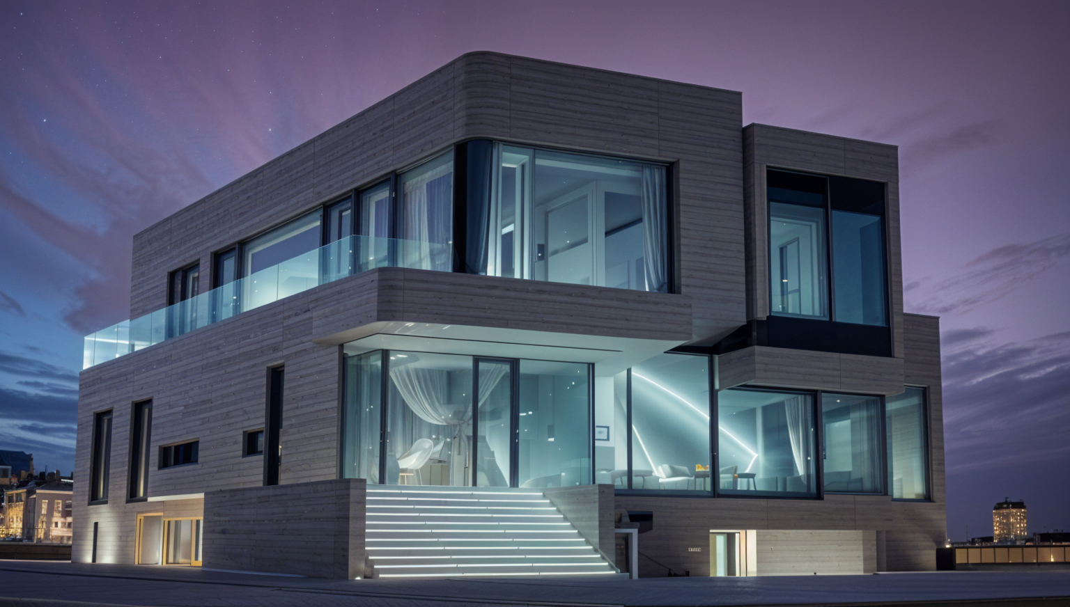 modernist exterior shot realistic rendering of a modern tropical elevated house featuring a modern staircase dark brown horizontal wood cladding beige painted walls and a warm lighted wall lamp beside the balcony door use a wood pvc ceiling with natural grain texture for a cozy tropical aesthetic emphasize realistic materials soft daylight reflections and balanced shadows to highlight the contrast between dark wood tones and beige walls architecture
