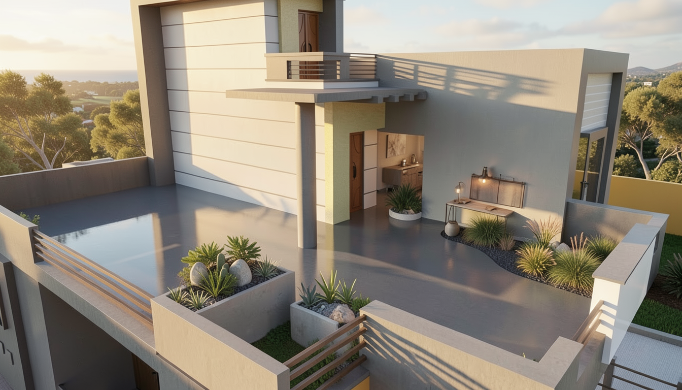 the home is set in a residential neighborhood with mature evergreen trees a green lawn and a border garden bed the exterior materials on the continuous two story walls is over grouted white washed stone the area between the two story stone walls is a white stucco with white window frames and white trim the roof is a black architectural shingle roof the time of day is sunset and there are clouds in the sky