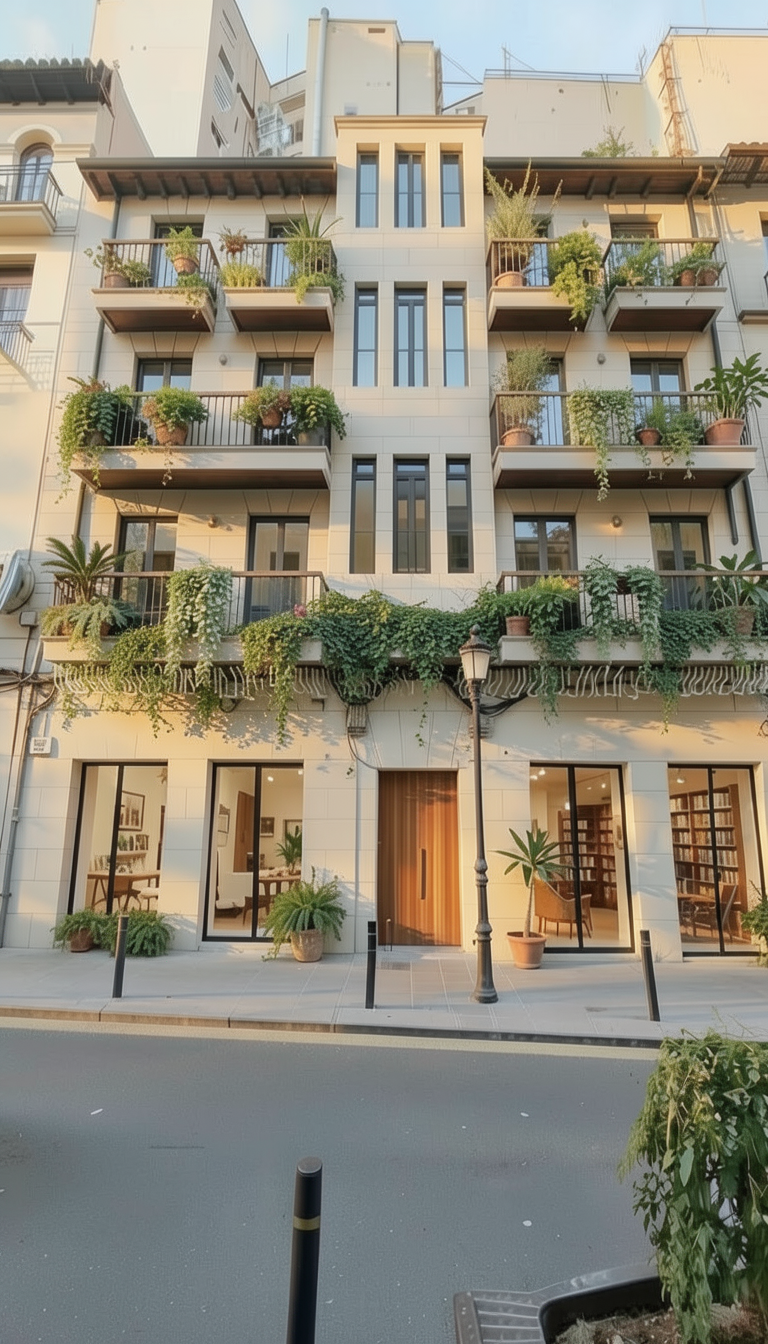 a modern architectural building with clean sharp lines and tiered layers render it in a serene dusk atmosphere with warm ambient lighting casting soft shadows the building should be a sleek combination of light gray and off white concrete with floor to ceiling glass windows reflecting the ambient light surrounding structures should have a subtle gradient of darker grays to emphasize depth the sky is a gradient of deep indigo transitioning to a soft lavender highlighting the architecture s modern elegance