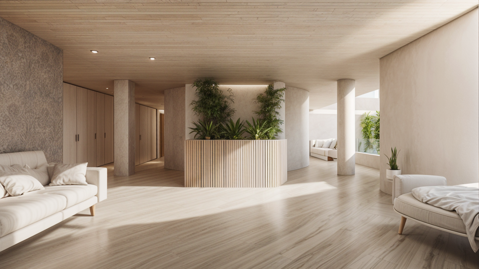 modern interior shot floor in oak bright ceiling in fir all panels white dull architecture