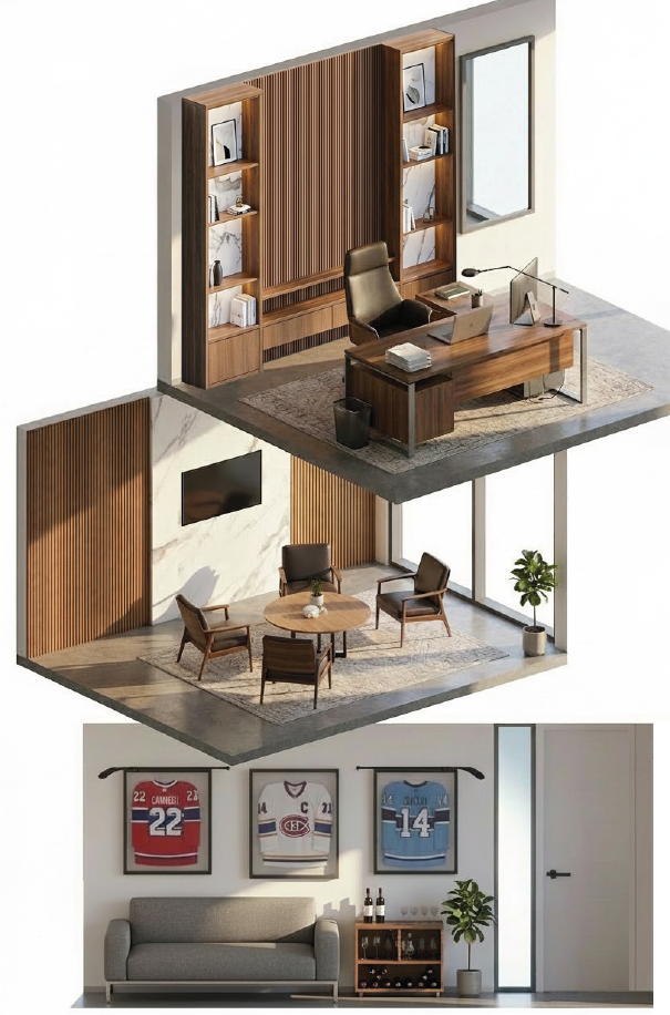 convert this floor plan into a realistic isometric 3d view of a office show the space from an elevated angle with furniture walls and details visible make the floors light wood color vinyl use the same furniture as shows on the plan do not change the orientation of the floorplan